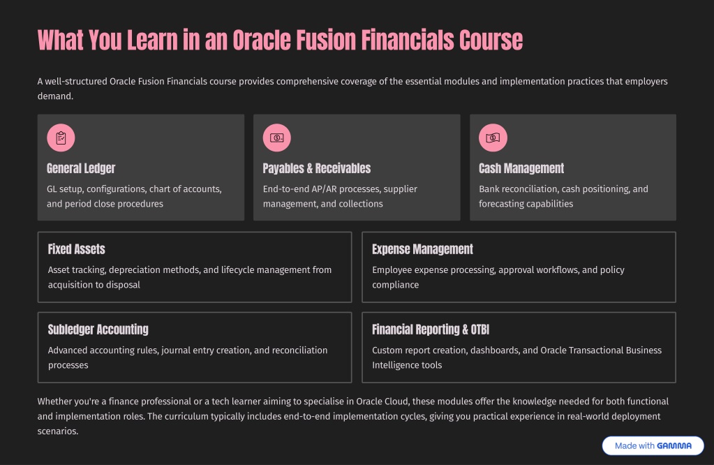 What You Learn in an Oracle Fusion Financials Course A well-structured Oracle Fusion Financials course provides comprehensive coverage of the essential modules and implementation practices that employers demand. General Ledger Payables & Receivables Cash Management GL setup, configurations, chart of accounts, and period close procedures End-to-end AP/AR processes, supplier management, and collections Bank reconciliation, cash positioning, and forecasting capabilities Fixed Assets Expense Management Asset tracking, depreciation methods, and lifecycle management from acquisition to disposal Employee expense processing, approval workflows, and policy compliance Subledger Accounting Financial Reporting & OTBI Advanced accounting rules, journal entry creation, and reconciliation processes Custom report creation, dashboards, and Oracle Transactional Business Intelligence tools Whether you're a finance professional or a tech learner aiming to specialise in Oracle Cloud, these modules offer the knowledge needed for both functional and implementation roles. The curriculum typically includes end-to-end implementation cycles, giving you practical experience in real-world deployment scenarios.