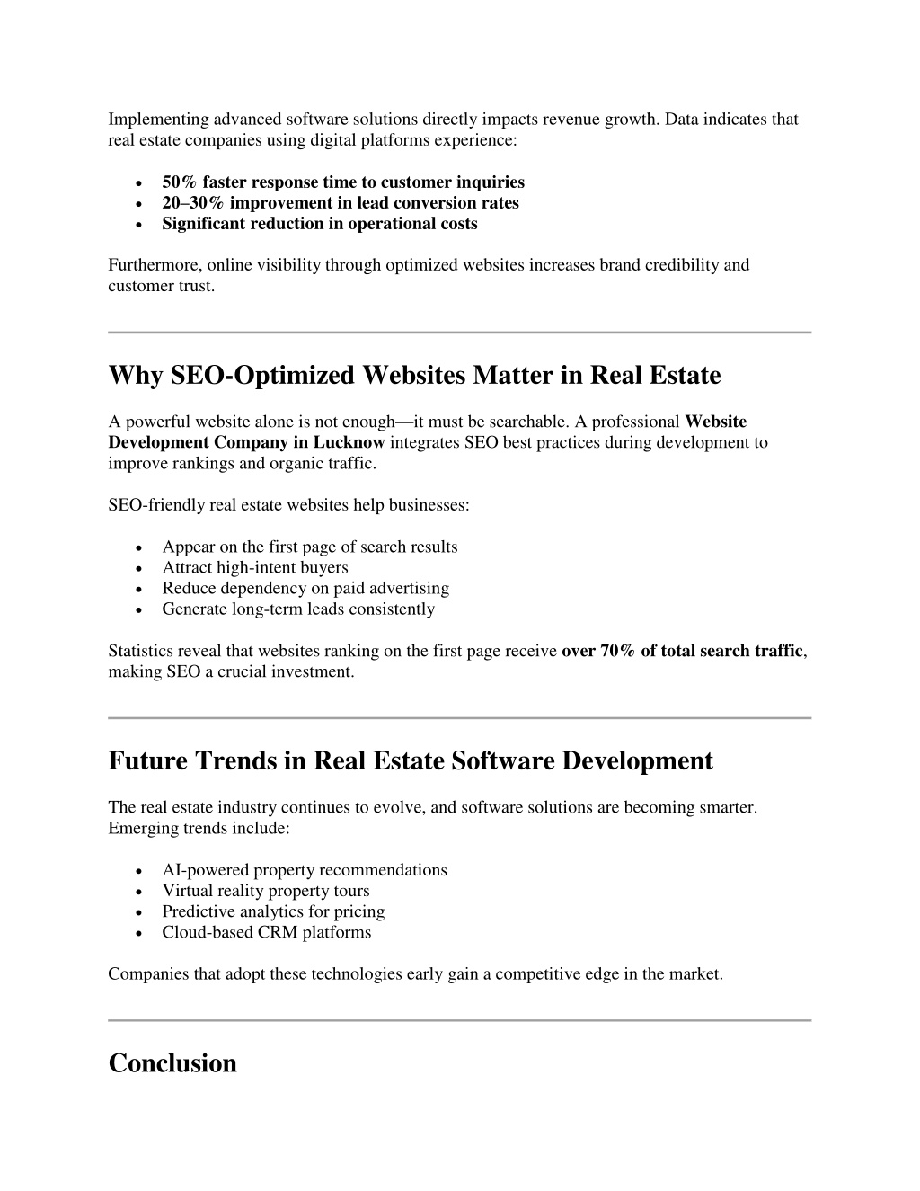 Implementing advanced software solutions directly impacts revenue growth. Data indicates that real estate companies using digital platforms experience: 50% faster response time to customer inquiries 20–30% improvement in lead conversion rates Significant reduction in operational costs Furthermore, online visibility through optimized websites increases brand credibility and customer trust. Why SEO-Optimized Websites Matter in Real Estate A powerful website alone is not enough—it must be searchable. A professional Website Development Company in Lucknow integrates SEO best practices during development to improve rankings and organic traffic. SEO-friendly real estate websites help businesses: Appear on the first page of search results Attract high-intent buyers Reduce dependency on paid advertising Generate long-term leads consistently Statistics reveal that websites ranking on the first page receive over 70% of total search traffic, making SEO a crucial investment. Future Trends in Real Estate Software Development The real estate industry continues to evolve, and software solutions are becoming smarter. Emerging trends include: AI-powered property recommendations Virtual reality property tours Predictive analytics for pricing Cloud-based CRM platforms Companies that adopt these technologies early gain a competitive edge in the market. Conclusion