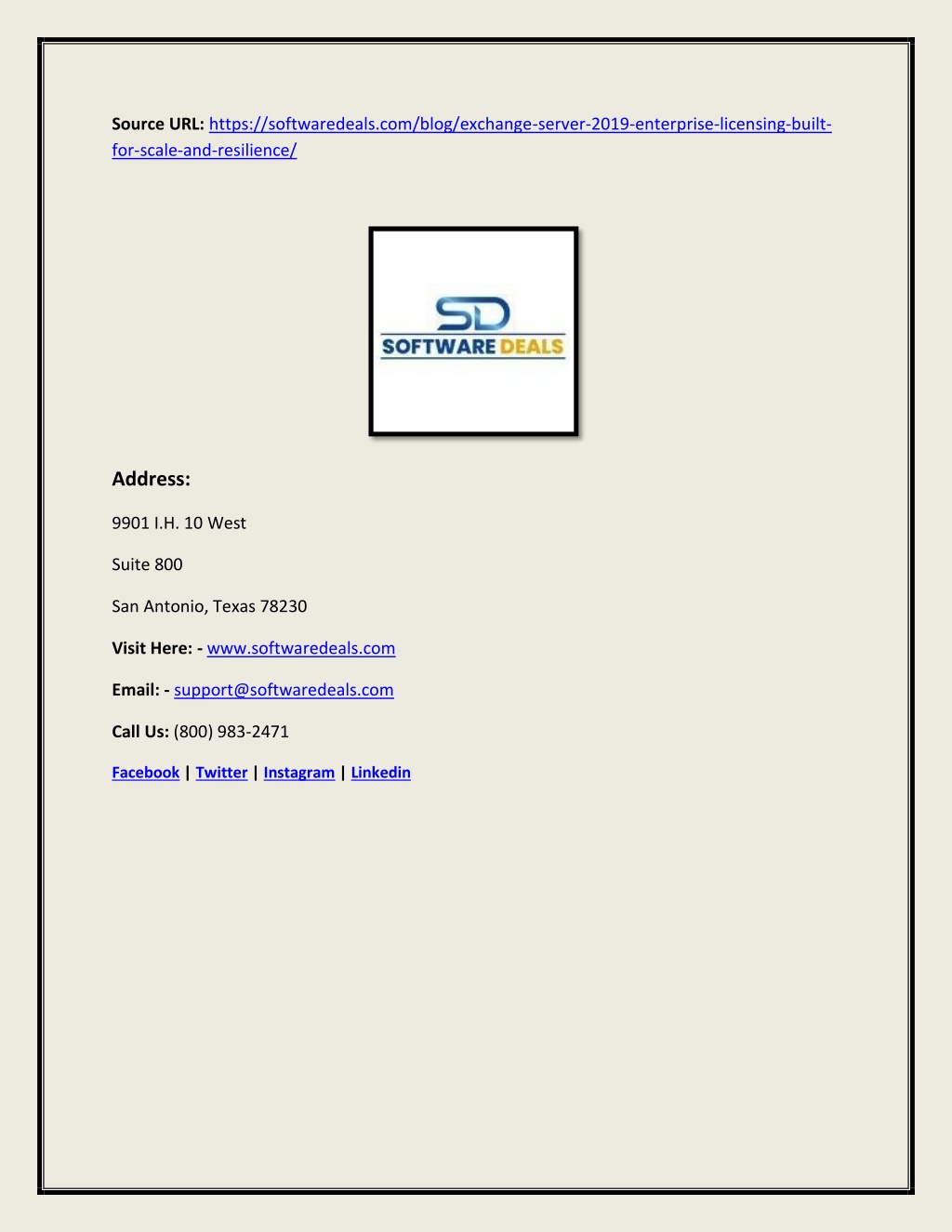 Source URL: https://softwaredeals.com/blog/exchange-server-2019-enterprise-licensing-built- for-scale-and-resilience/ Address: 9901 I.H. 10 West Suite 800 San Antonio, Texas 78230 Visit Here: - www.softwaredeals.com Email: - support@softwaredeals.com Call Us: (800) 983-2471 Facebook | Twitter | Instagram | Linkedin