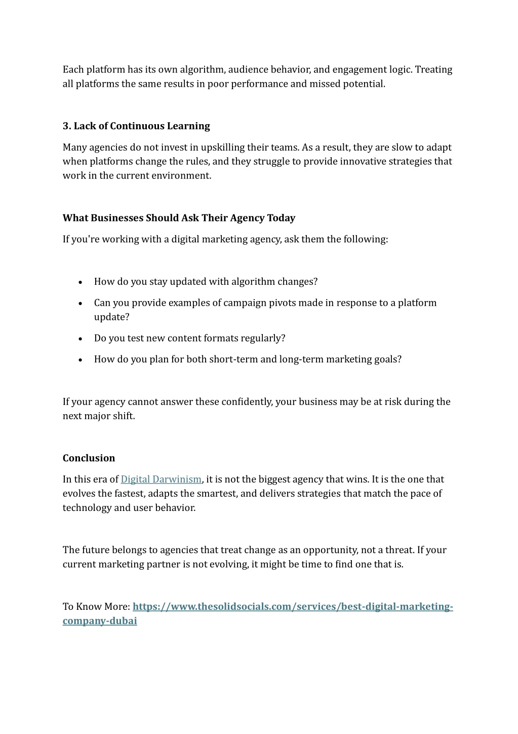 Each platform has its own algorithm, audience behavior, and engagement logic. Treating all platforms the same results in poor performance and missed potential. 3. Lack of Continuous Learning Many agencies do not invest in upskilling their teams. As a result, they are slow to adapt when platforms change the rules, and they struggle to provide innovative strategies that work in the current environment. What Businesses Should Ask Their Agency Today If you're working with a digital marketing agency, ask them the following: How do you stay updated with algorithm changes? Can you provide examples of campaign pivots made in response to a platform update? Do you test new content formats regularly? How do you plan for both short-term and long-term marketing goals? If your agency cannot answer these confidently, your business may be at risk during the next major shift. Conclusion In this era of Digital Darwinism, it is not the biggest agency that wins. It is the one that evolves the fastest, adapts the smartest, and delivers strategies that match the pace of technology and user behavior. The future belongs to agencies that treat change as an opportunity, not a threat. If your current marketing partner is not evolving, it might be time to find one that is. To Know More: https://www.thesolidsocials.com/services/best-digital-marketing- company-dubai