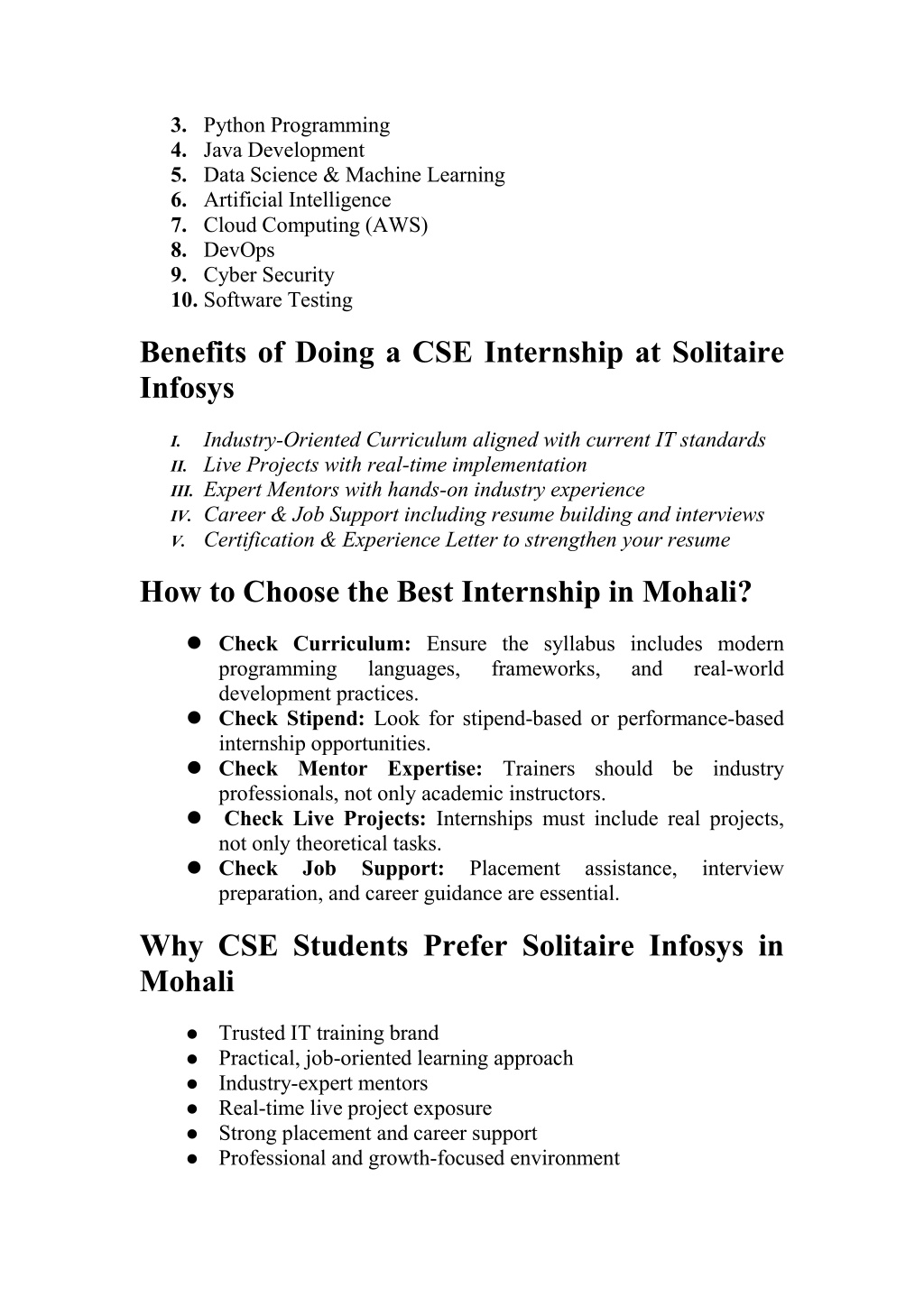 3. 3. Python Programming 4. Java Development 5. Data Science & Machine Learning 6. Artificial Intelligence 7. Cloud Computing (AWS) 8. DevOps 9. Cyber Security 10. Software Testing Benefits of Doing a CSE Internship at Solitaire Infosys Industry-Oriented Curriculum aligned with current IT standards I. II. Live Projects with real-time implementation III. Expert Mentors with hands-on industry experience IV. Career & Job Support including resume building and interviews V. Certification & Experience Letter to strengthen your resume How to Choose the Best Internship in Mohali?  Check Curriculum: Ensure the syllabus includes modern programming languages, development practices.  Check Stipend: Look for stipend-based or performance-based internship opportunities.  Check Mentor Expertise: professionals, not only academic instructors.  Check Live Projects: Internships must include real projects, not only theoretical tasks.  Check Job Support: Placement preparation, and career guidance are essential. frameworks, and real-world Trainers should be industry assistance, interview Why CSE Students Prefer Solitaire Infosys in Mohali Trusted IT training brand Practical, job-oriented learning approach Industry-expert mentors Real-time live project exposure Strong placement and career support Professional and growth-focused environment      
