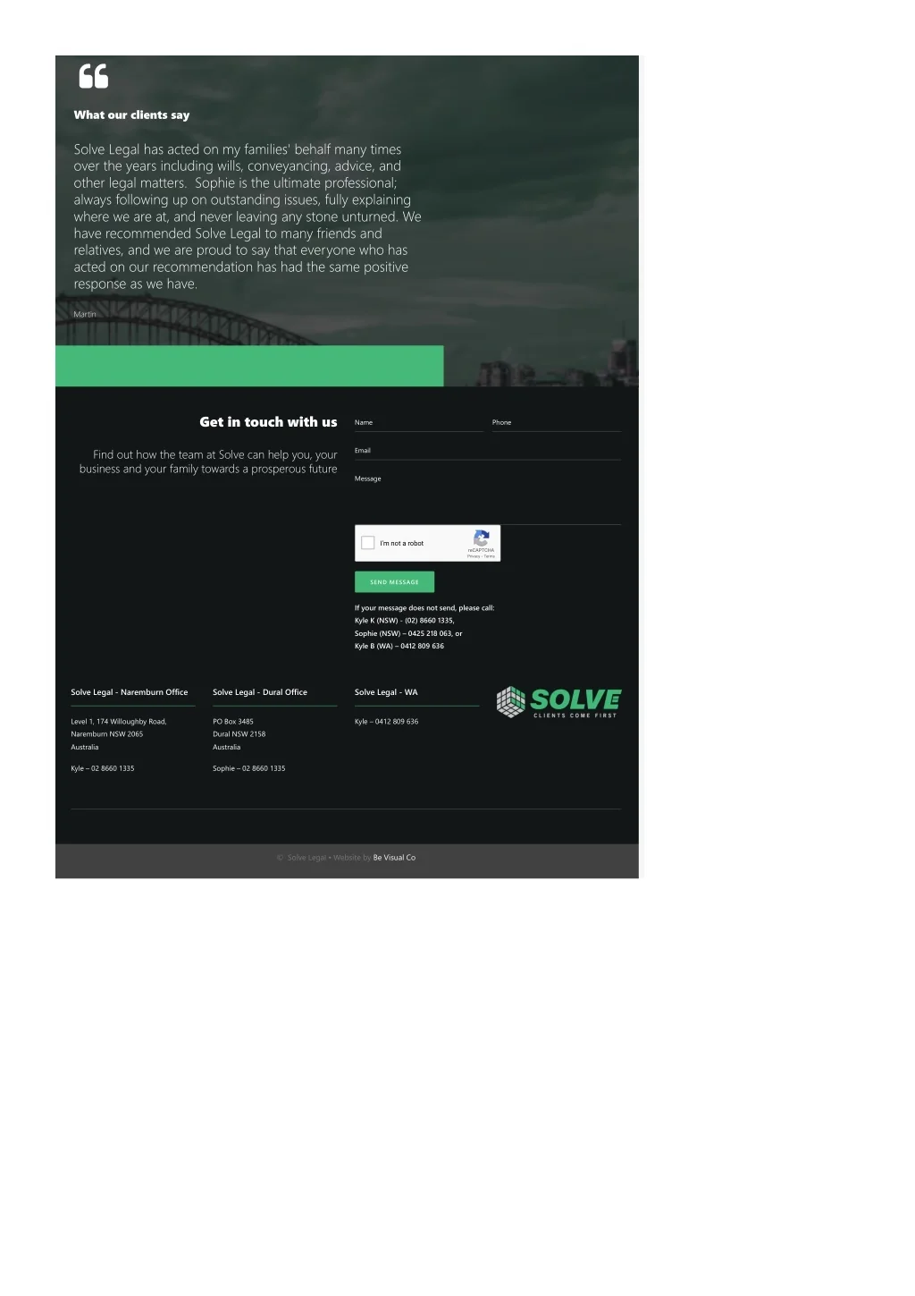 What our clients say Solve Legal has acted on my families' behalf many times over the years including wills, conveyancing, advice, and other legal matters. Sophie is the ultimate professional; always following up on outstanding issues, fully explaining where we are at, and never leaving any stone unturned. We have recommended Solve Legal to many friends and relatives, and we are proud to say that everyone who has acted on our recommendation has had the same positive response as we have. Martin Get in touch with us Name Phone Email Find out how the team at Solve can help you, your business and your family towards a prosperous future Message I'm not a robot reCAPTCHA Privacy - Terms SEND MESSAGE If your message does not send, please call: Kyle K (NSW) - (02) 8660 1335, Sophie (NSW) – 0425 218 063, or Kyle B (WA) – 0412 809 636 Solve Legal - Naremburn Office Solve Legal - Dural Office Solve Legal - WA Level 1, 174 Willoughby Road, Naremburn NSW 2065 Australia PO Box 3485 Dural NSW 2158 Australia Kyle – 0412 809 636 Kyle – 02 8660 1335 Sophie – 02 8660 1335 © Solve Legal • Website by Be Visual Co