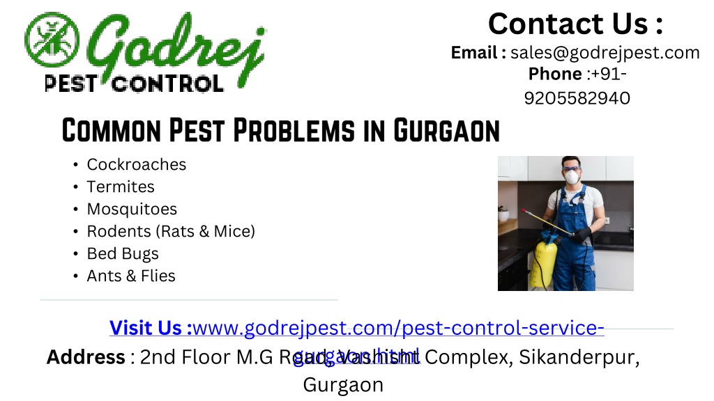 Contact Us : • Email : sales@godrejpest.com • Phone :+91-9205582940 • Common Pest Problems in Gurgaon • Cockroaches • Termites • Mosquitoes • Rodents (Rats & Mice) • Bed Bugs • Ants & Flies • Visit Us :www.godrejpest.com/pest-control-service-gurgaon.html • Address : 2nd Floor M.G Road, Vashisht Complex, Sikanderpur, Gurgaon