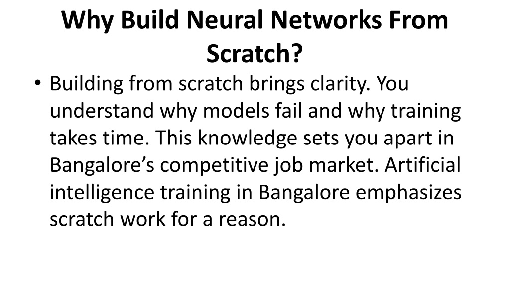 Why Build Neural Networks From Scratch? • Building from scratch brings clarity. You understand why models fail and why training takes time. This knowledge sets you apart in Bangalore’s competitive job market. Artificial intelligence training in Bangalore emphasizes scratch work for a reason.