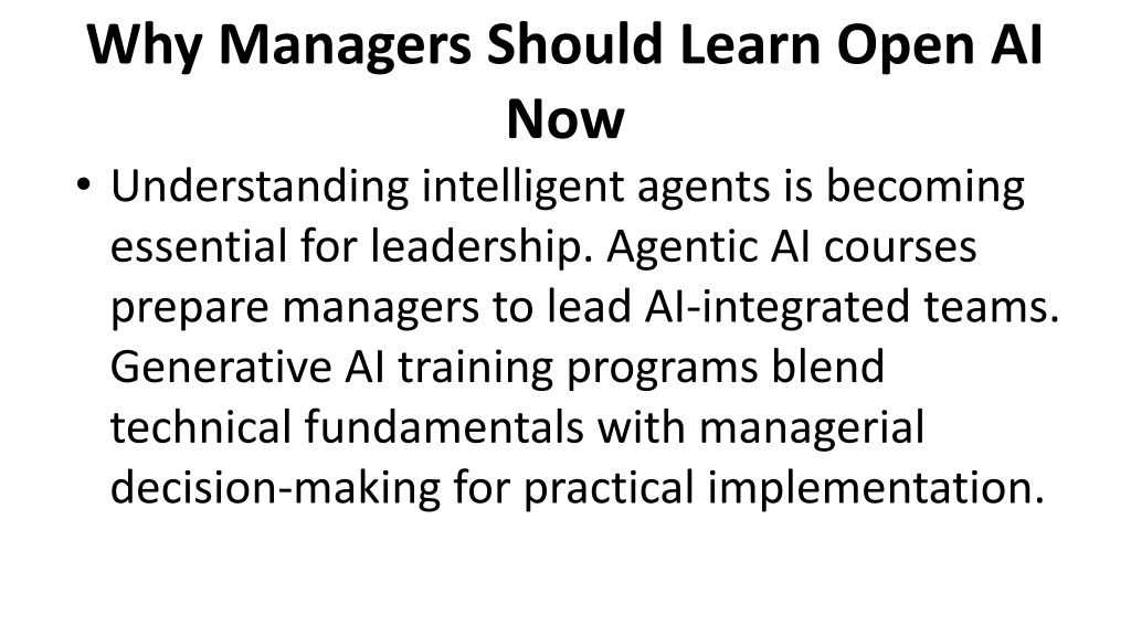 6. Why Managers Should Learn Open AI Now • Understanding intelligent agents is becoming essential for leadership. Agentic AI courses prepare managers to lead AI-integrated teams. Generative AI training programs blend technical fundamentals with managerial decision-making for practical implementation.