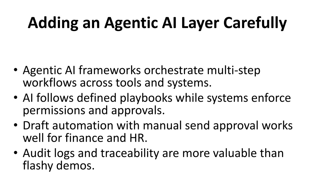 Adding an Agentic AI Layer Carefully • Agentic AI frameworks orchestrate multi-step workflows across tools and systems. • AI follows defined playbooks while systems enforce permissions and approvals. • Draft automation with manual send approval works well for finance and HR. • Audit logs and traceability are more valuable than flashy demos.