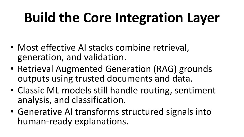 Build the Core Integration Layer • Most effective AI stacks combine retrieval, generation, and validation. • Retrieval Augmented Generation (RAG) grounds outputs using trusted documents and data. • Classic ML models still handle routing, sentiment analysis, and classification. • Generative AI transforms structured signals into human-ready explanations.