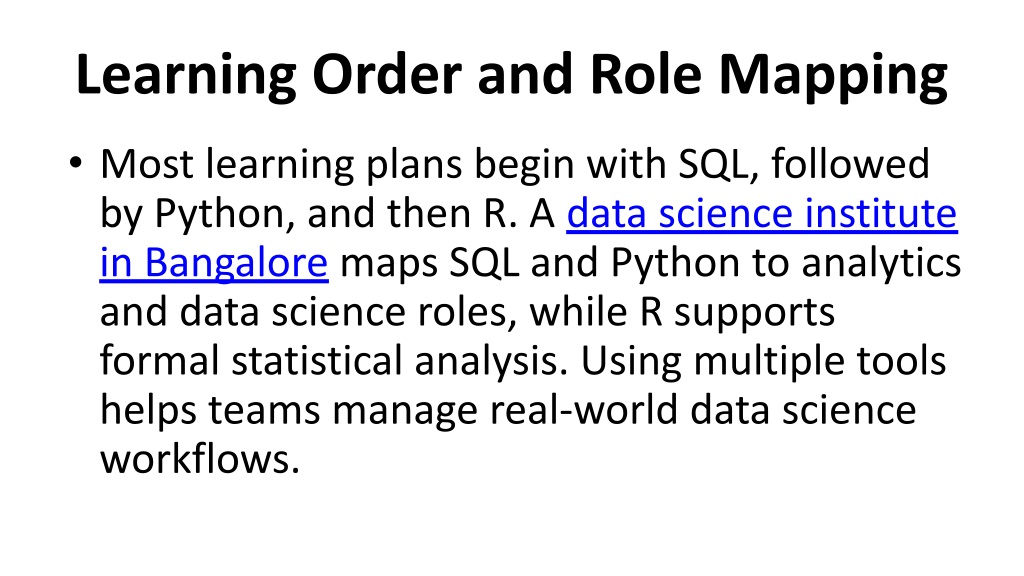Learning Order and Role Mapping • Most learning plans begin with SQL, followed by Python, and then R. A data science institute in Bangalore maps SQL and Python to analytics and data science roles, while R supports formal statistical analysis. Using multiple tools helps teams manage real-world data science workflows.
