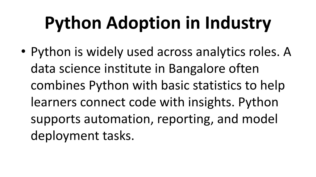 Python Adoption in Industry • Python is widely used across analytics roles. A data science institute in Bangalore often combines Python with basic statistics to help learners connect code with insights. Python supports automation, reporting, and model deployment tasks.