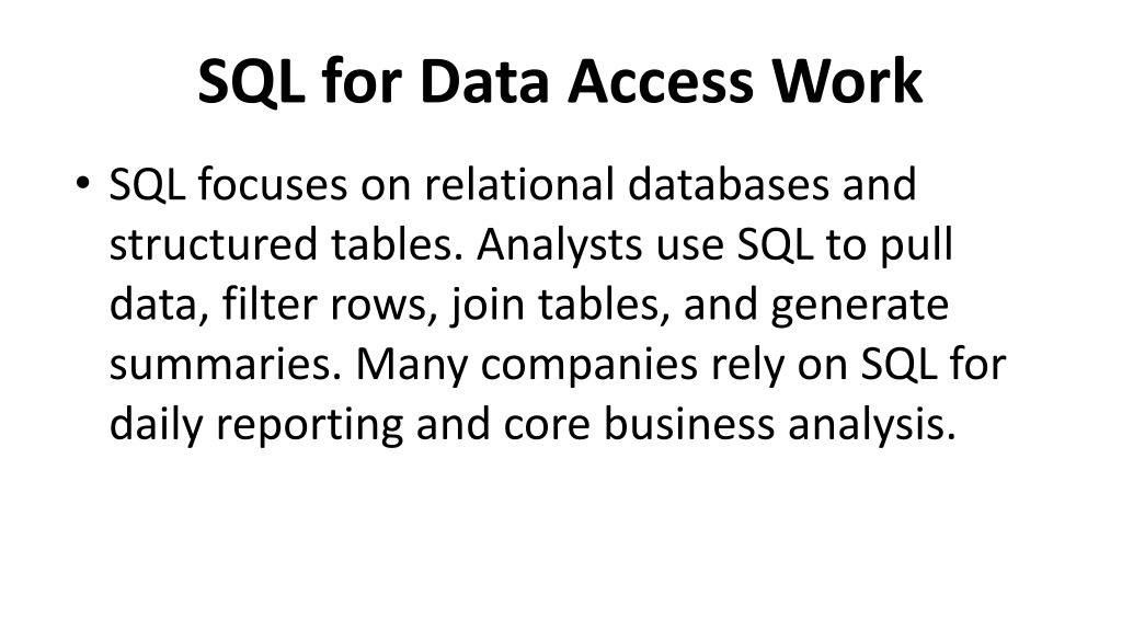 SQL for Data Access Work • SQL focuses on relational databases and structured tables. Analysts use SQL to pull data, filter rows, join tables, and generate summaries. Many companies rely on SQL for daily reporting and core business analysis.