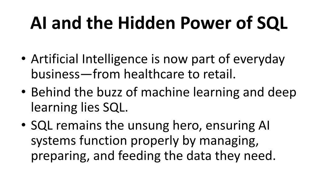 AI and the Hidden Power of SQL • Artificial Intelligence is now part of everyday business—from healthcare to retail. • Behind the buzz of machine learning and deep learning lies SQL. • SQL remains the unsung hero, ensuring AI systems function properly by managing, preparing, and feeding the data they need.