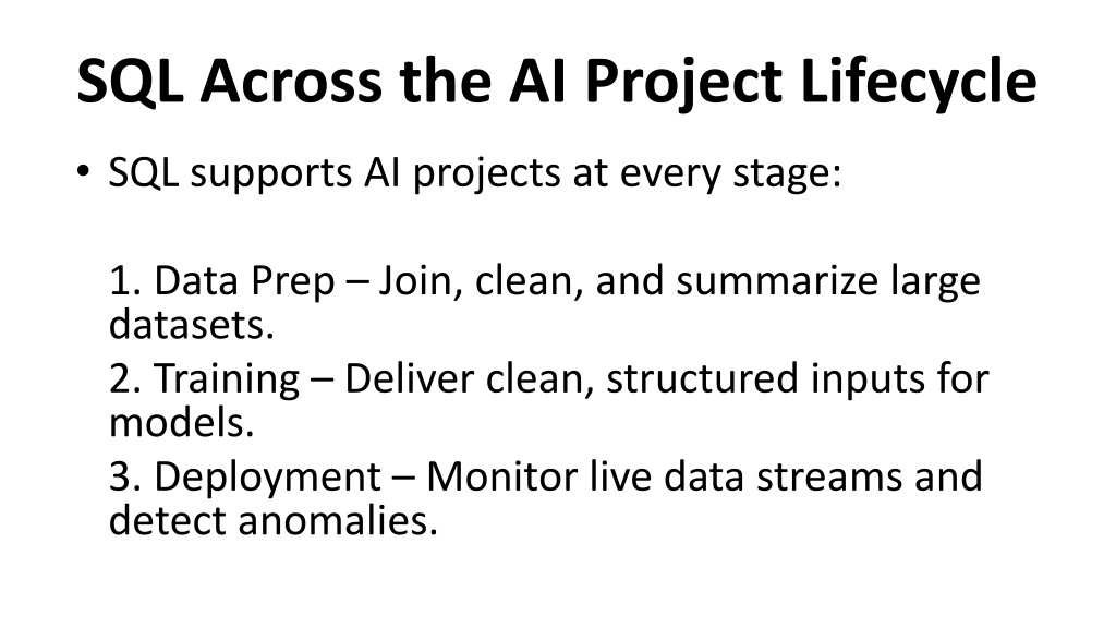 SQL Across the AI Project Lifecycle • SQL supports AI projects at every stage: 1. Data Prep – Join, clean, and summarize large datasets. 2. Training – Deliver clean, structured inputs for models. 3. Deployment – Monitor live data streams and detect anomalies.