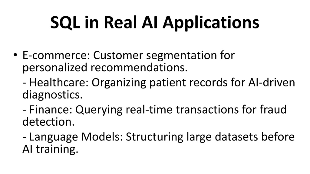 SQL in Real AI Applications • E-commerce: Customer segmentation for personalized recommendations. - Healthcare: Organizing patient records for AI-driven diagnostics. - Finance: Querying real-time transactions for fraud detection. - Language Models: Structuring large datasets before AI training.