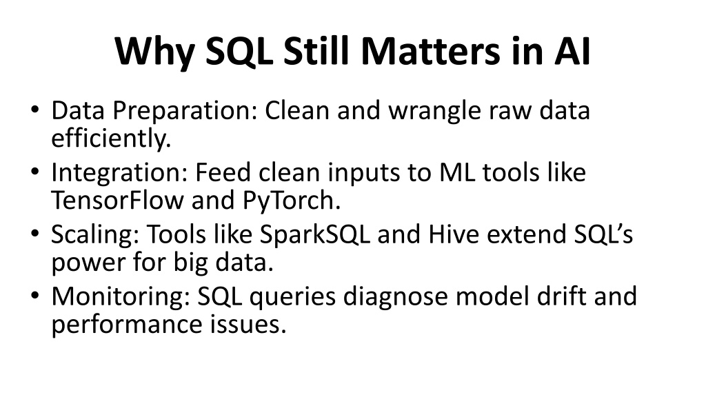 Why SQL Still Matters in AI • Data Preparation: Clean and wrangle raw data efficiently. • Integration: Feed clean inputs to ML tools like TensorFlow and PyTorch. • Scaling: Tools like SparkSQL and Hive extend SQL’s power for big data. • Monitoring: SQL queries diagnose model drift and performance issues.