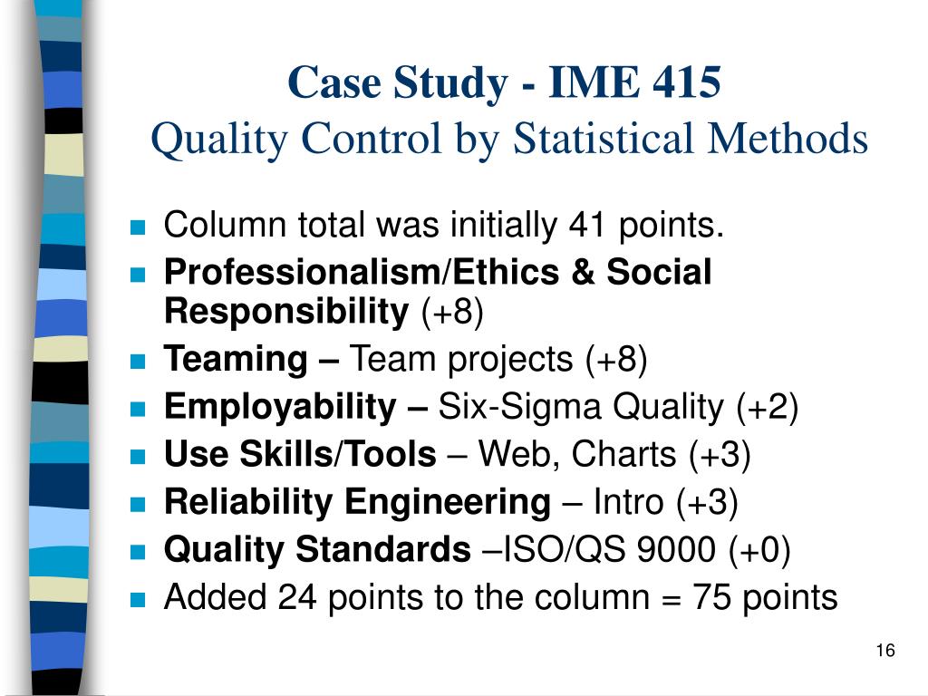 Case Study - IME 415 Quality Control by Statistical Methods • Column total was initially 41 points. • Professionalism/Ethics & Social Responsibility (+8) • Teaming – Team projects (+8) • Employability – Six-Sigma Quality (+2) • Use Skills/Tools – Web, Charts (+3) • Reliability Engineering – Intro (+3) • Quality Standards –ISO/QS 9000 (+0) • Added 24 points to the column = 75 points