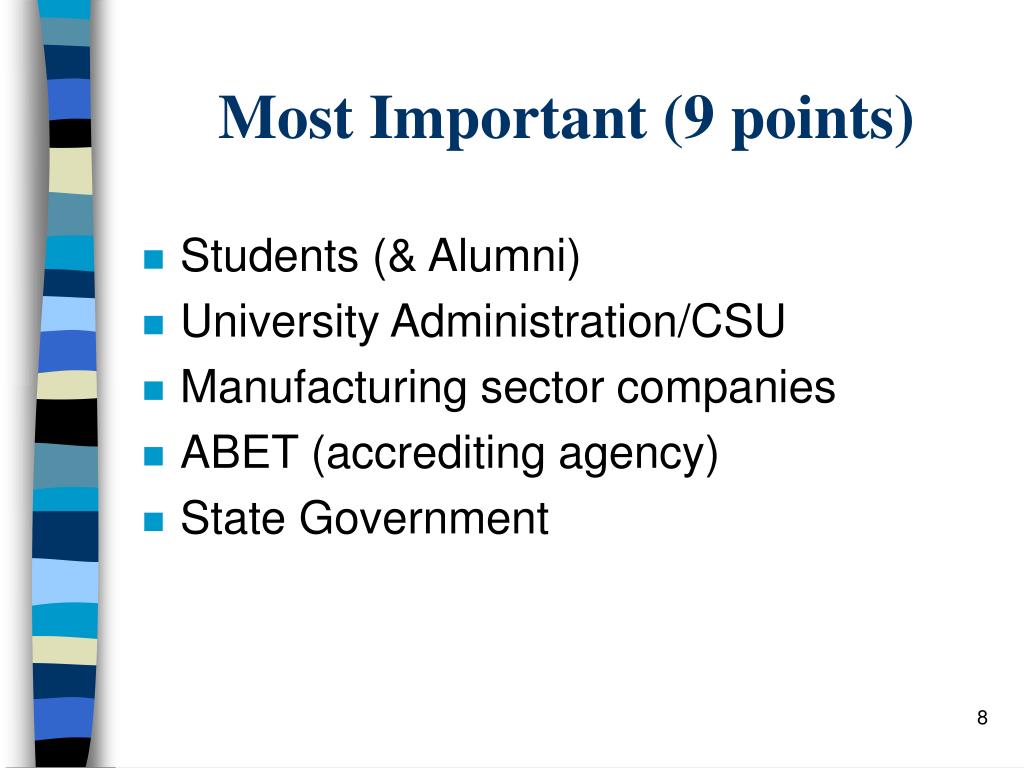 Most Important (9 points) • Students (& Alumni) • University Administration/CSU • Manufacturing sector companies • ABET (accrediting agency) • State Government