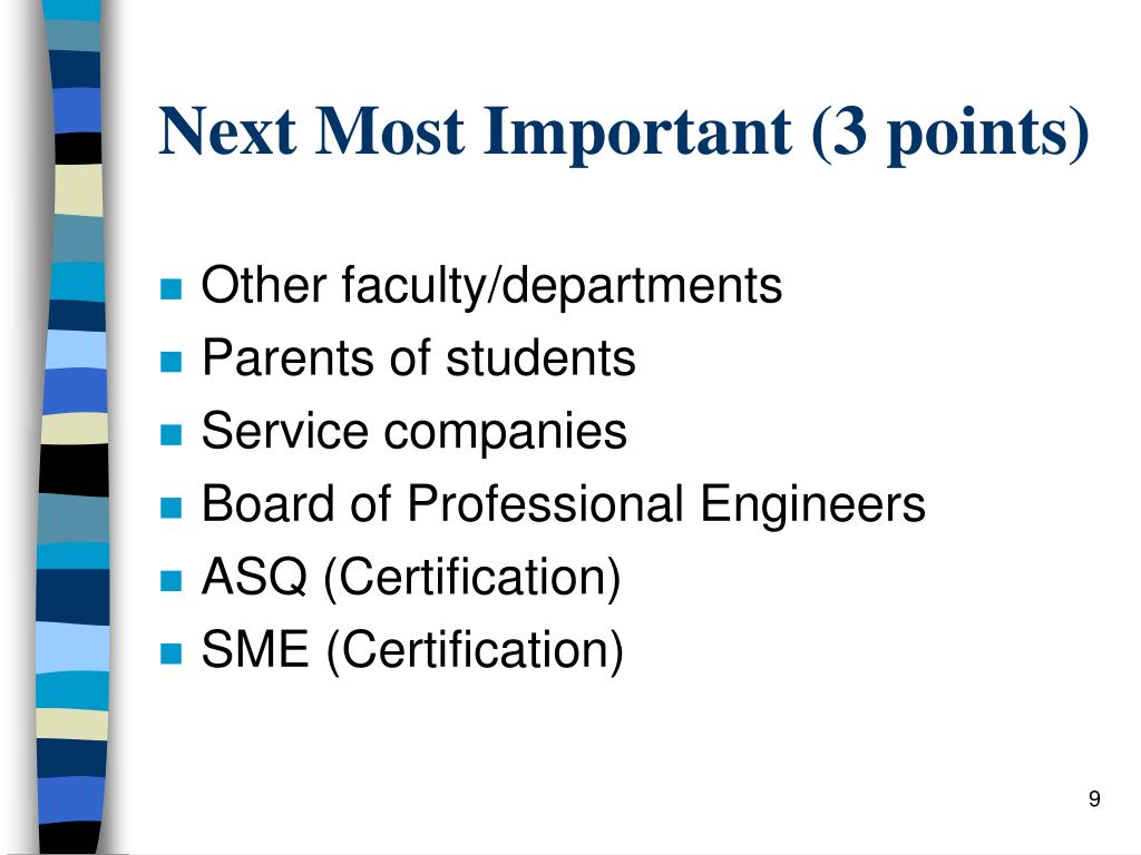 Next Most Important (3 points) • Other faculty/departments • Parents of students • Service companies • Board of Professional Engineers • ASQ (Certification) • SME (Certification)