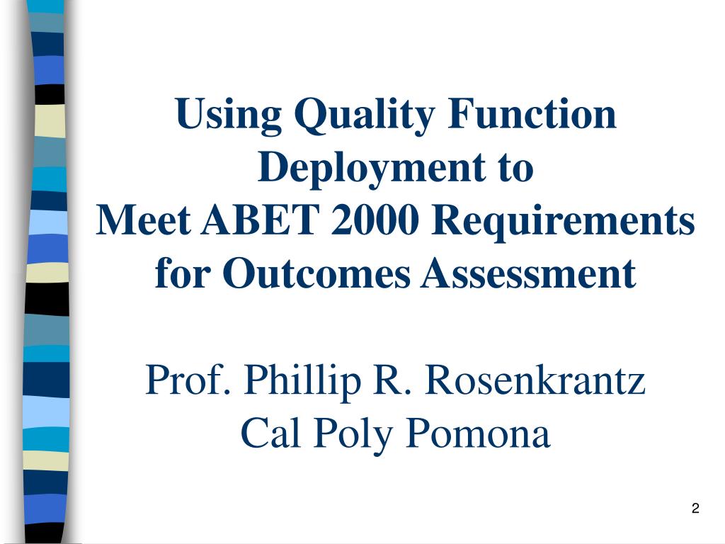 Using Quality Function Deployment to Meet ABET 2000 Requirements for Outcomes AssessmentProf. Phillip R. RosenkrantzCal Poly Pomona