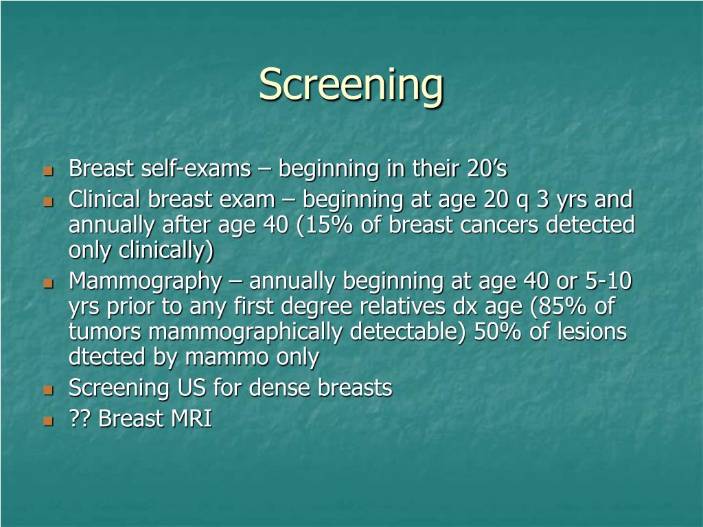 Screening • Breast self-exams – beginning in their 20’s • Clinical breast exam – beginning at age 20 q 3 yrs and annually after age 40 (15% of breast cancers detected only clinically) • Mammography – annually beginning at age 40 or 5-10 yrs prior to any first degree relatives dx age (85% of tumors mammographically detectable) 50% of lesions dtected by mammo only • Screening US for dense breasts • ?? Breast MRI