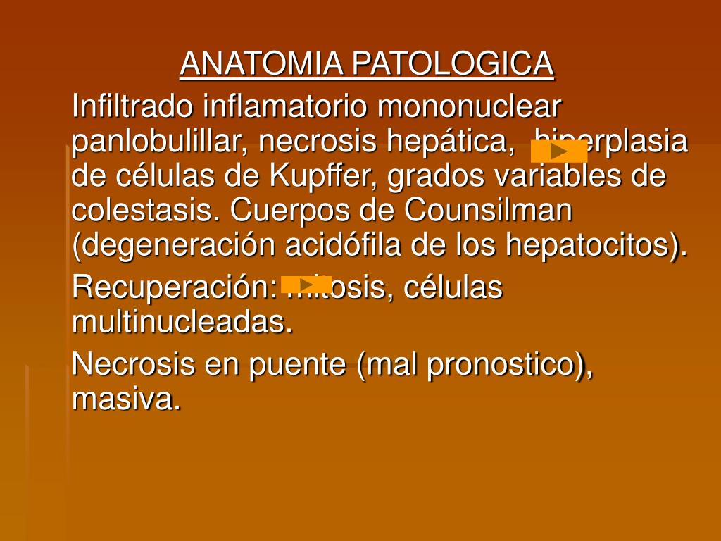 ANATOMIA PATOLOGICA Infiltrado inflamatorio mononuclear panlobulillar, necrosis hepática, hiperplasia de células de Kupffer, grados variables de colestasis. Cuerpos de Counsilman (degeneración acidófila de los hepatocitos). Recuperación: mitosis, células multinucleadas. Necrosis en puente (mal pronostico), masiva.