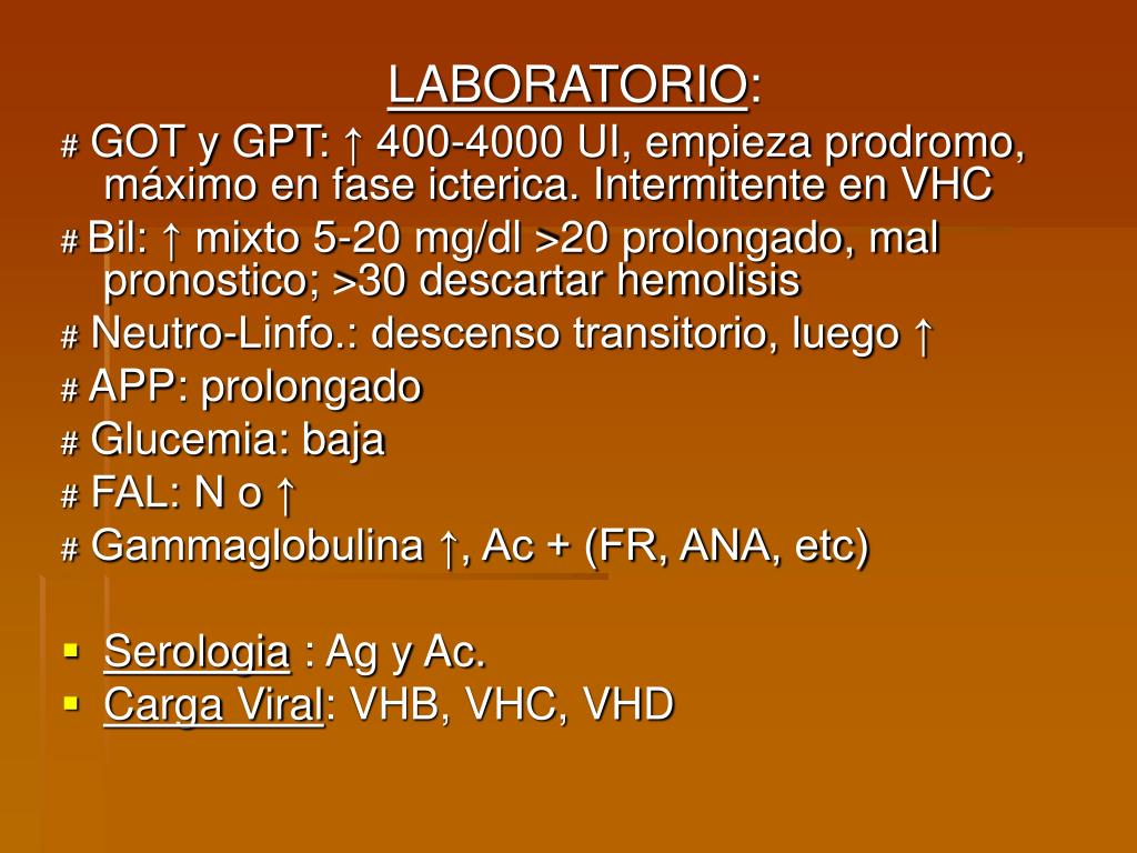 LABORATORIO: # GOT y GPT: ↑ 400-4000 UI, empieza prodromo, máximo en fase icterica. Intermitente en VHC # Bil: ↑ mixto 5-20 mg/dl >20 prolongado, mal pronostico; >30 descartar hemolisis # Neutro-Linfo.: descenso transitorio, luego ↑ # APP: prolongado # Glucemia: baja # FAL: N o ↑ # Gammaglobulina ↑, Ac + (FR, ANA, etc) • Serologia : Ag y Ac. • Carga Viral: VHB, VHC, VHD