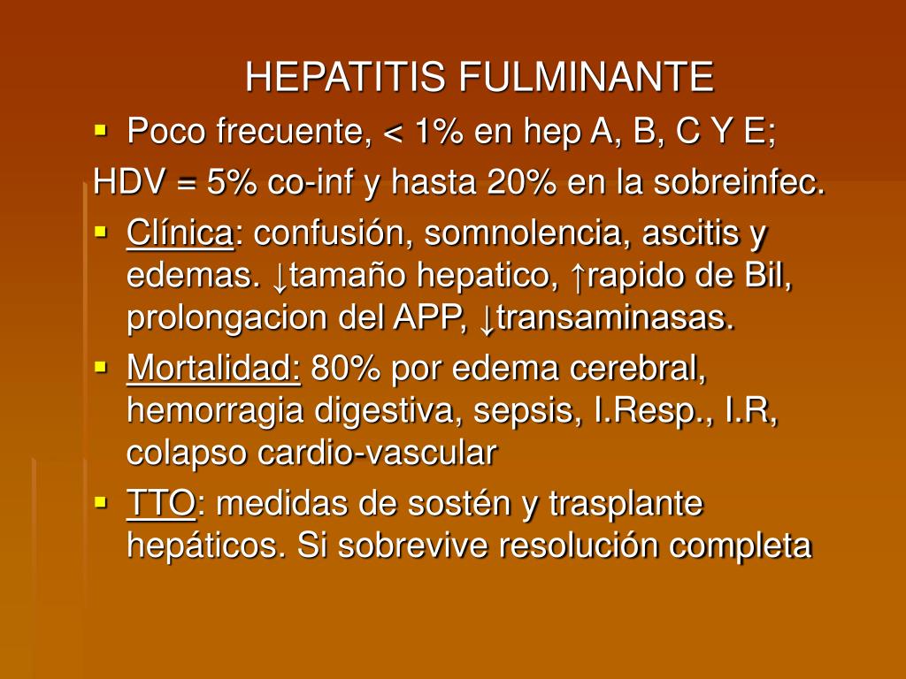 HEPATITIS FULMINANTE • Poco frecuente, < 1% en hep A, B, C Y E; HDV = 5% co-inf y hasta 20% en la sobreinfec. • Clínica: confusión, somnolencia, ascitis y edemas. ↓tamaño hepatico, ↑rapido de Bil, prolongacion del APP, ↓transaminasas. • Mortalidad: 80% por edema cerebral, hemorragia digestiva, sepsis, I.Resp., I.R, colapso cardio-vascular • TTO: medidas de sostén y trasplante hepáticos. Si sobrevive resolución completa