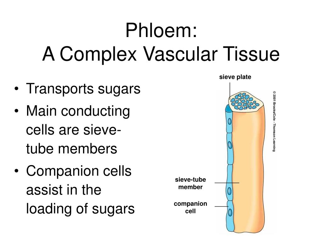 Phloem: A Complex Vascular Tissue • Transports sugars • Main conducting cells are sieve-tube members • Companion cells assist in the loading of sugars sieve plate sieve-tube member companion cell