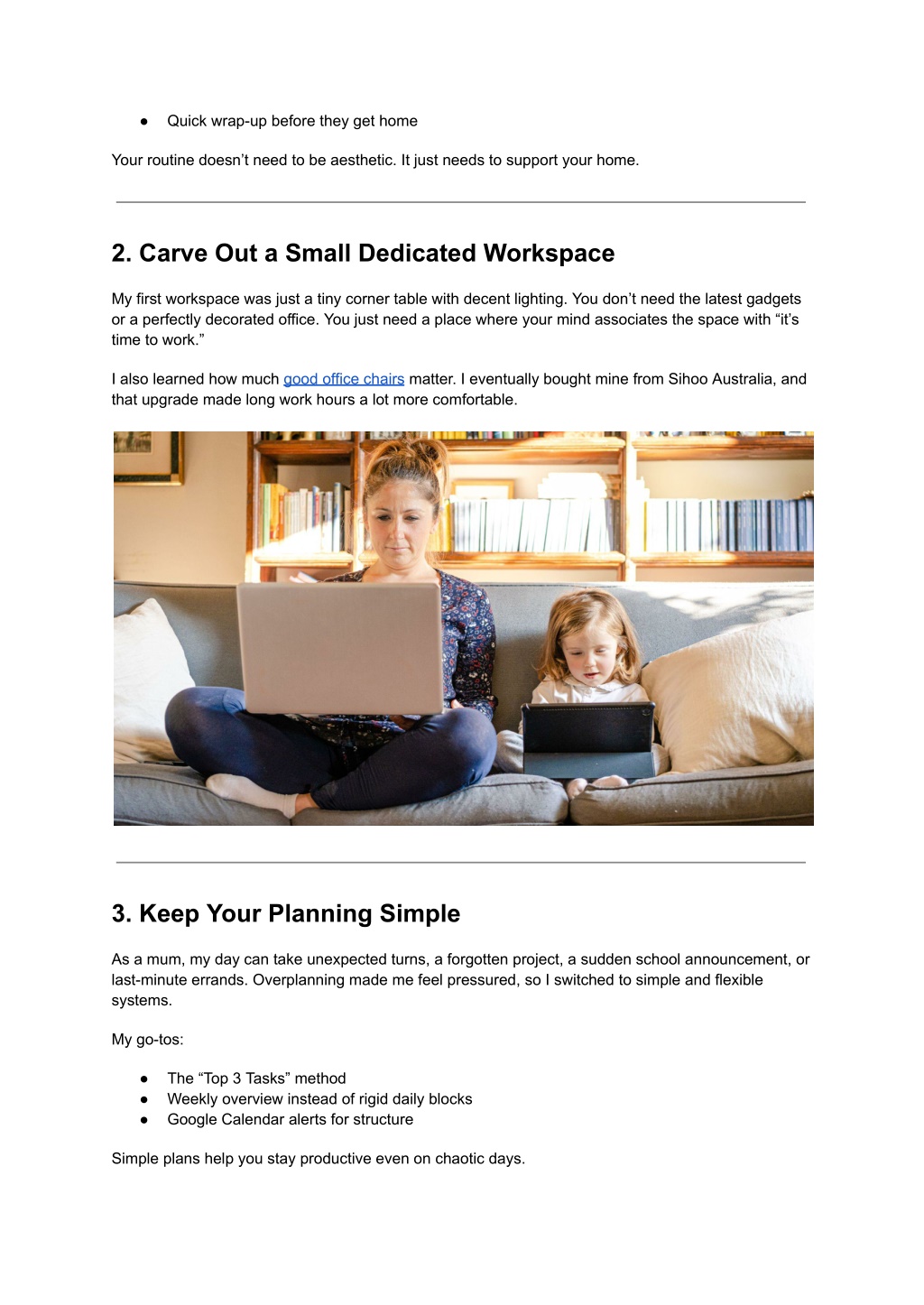 ● Quick wrap-up before they get home Your routine doesn’t need to be aesthetic. It just needs to support your home. 2. Carve Out a Small Dedicated Workspace My first workspace was just a tiny corner table with decent lighting. You don’t need the latest gadgets or a perfectly decorated office. You just need a place where your mind associates the space with “it’s time to work.” I also learned how much good office chairs matter. I eventually bought mine from Sihoo Australia, and that upgrade made long work hours a lot more comfortable. 3. Keep Your Planning Simple As a mum, my day can take unexpected turns, a forgotten project, a sudden school announcement, or last-minute errands. Overplanning made me feel pressured, so I switched to simple and flexible systems. My go-tos: ● ● ● The “Top 3 Tasks” method Weekly overview instead of rigid daily blocks Google Calendar alerts for structure Simple plans help you stay productive even on chaotic days.