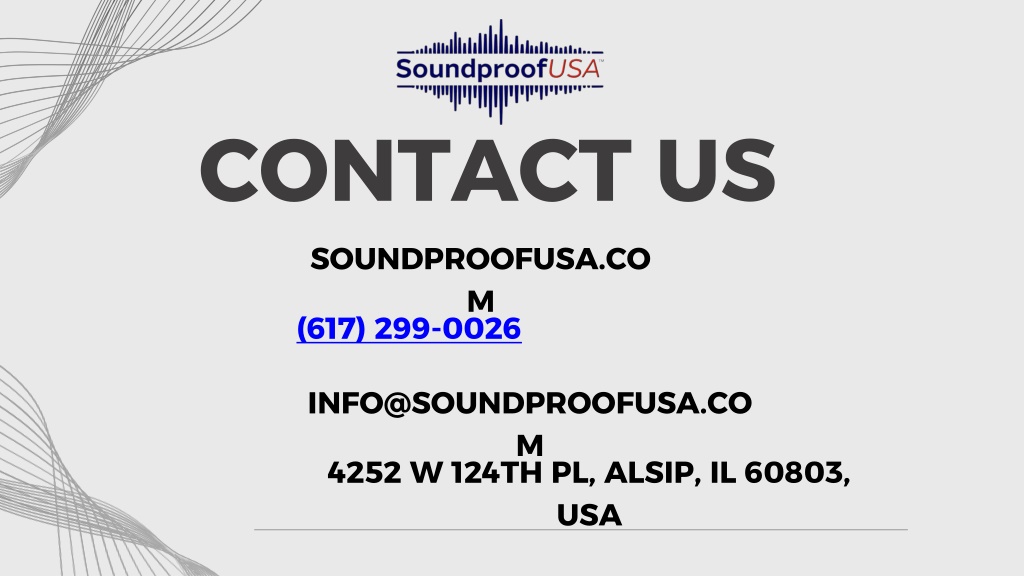 6. CONTACT US SOUNDPROOFUSA.COM (617) 299-0026 INFO@SOUNDPROOFUSA.COM 4252 W 124TH PL, ALSIP, IL 60803, USA