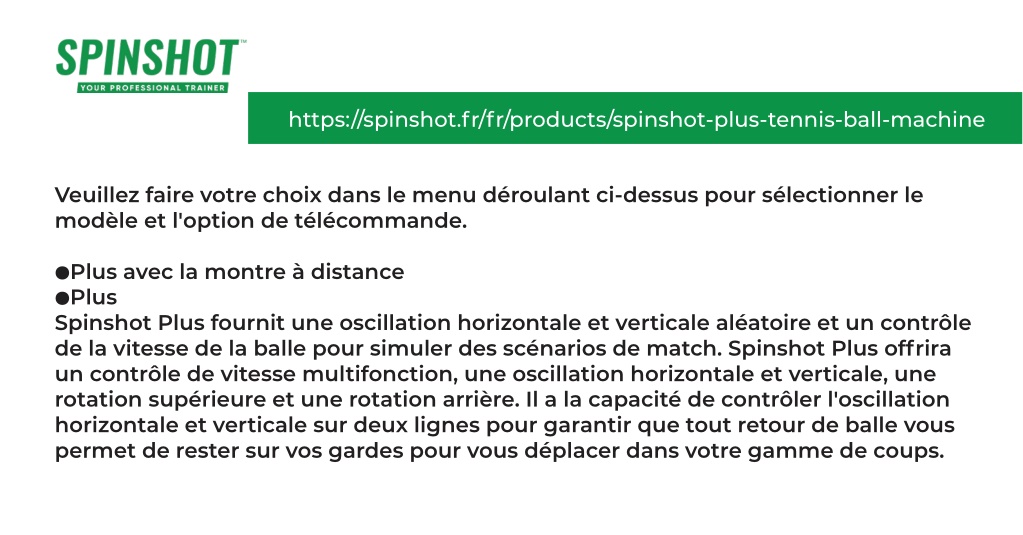 https://spinshot.fr/fr/products/spinshot-plus-tennis-ball-machinehttps://spinshot.fr/fr/products/spinshot-plus-tennis-ball-machine Veuillez faire votre choix dans le menu déroulant ci-dessus pour sélectionner le modèle et l'option de télécommande. .Plus avec la montre à distance .Plus Spinshot Plus fournit une oscillation horizontale et verticale aléatoire et un contrôle de la vitesse de la balle pour simuler des scénarios de match. Spinshot Plus offrira un contrôle de vitesse multifonction, une oscillation horizontale et verticale, une rotation supérieure et une rotation arrière. Il a la capacité de contrôler l'oscillation horizontale et verticale sur deux lignes pour garantir que tout retour de balle vous permet de rester sur vos gardes pour vous déplacer dans votre gamme de coups.