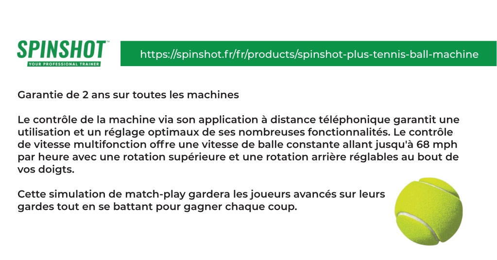 https://spinshot.fr/fr/products/spinshot-plus-tennis-ball-machinehttps://spinshot.fr/fr/products/spinshot-plus-tennis-ball-machine Garantie de 2 ans sur toutes les machines Le contrôle de la machine via son application à distance téléphonique garantit une utilisation et un réglage optimaux de ses nombreuses fonctionnalités. Le contrôle de vitesse multifonction offre une vitesse de balle constante allant jusqu'à 68 mph par heure avec une rotation supérieure et une rotation arrière réglables au bout de vos doigts. Cette simulation de match-play gardera les joueurs avancés sur leurs gardes tout en se battant pour gagner chaque coup.