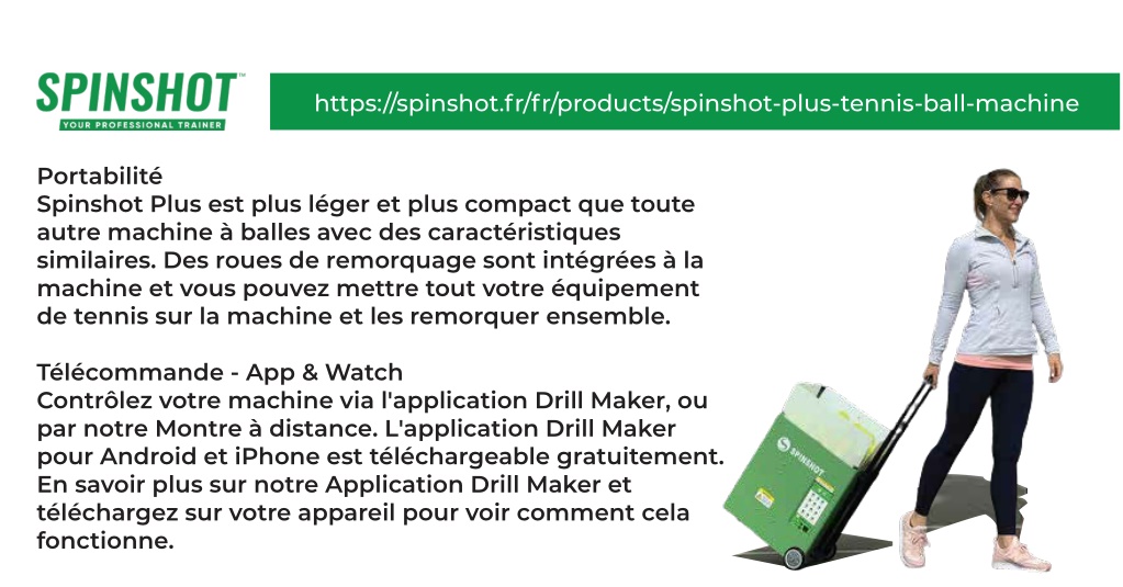 https://spinshot.fr/fr/products/spinshot-plus-tennis-ball-machinehttps://spinshot.fr/fr/products/spinshot-plus-tennis-ball-machine Portabilité Spinshot Plus est plus léger et plus compact que toute autre machine à balles avec des caractéristiques similaires. Des roues de remorquage sont intégrées à la machine et vous pouvez mettre tout votre équipement de tennis sur la machine et les remorquer ensemble. Télécommande - App & Watch Contrôlez votre machine via l'application Drill Maker, ou par notre Montre à distance. L'application Drill Maker pour Android et iPhone est téléchargeable gratuitement. En savoir plus sur notre Application Drill Maker et téléchargez sur votre appareil pour voir comment cela fonctionne.