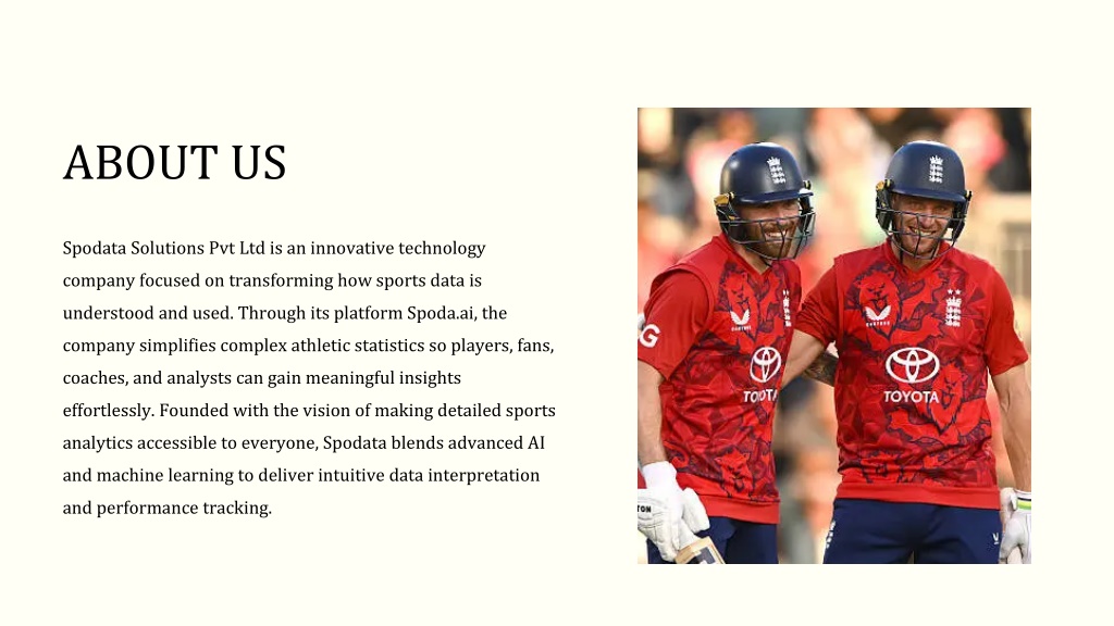 ABOUT US Spodata Solutions Pvt Ltd is an innovative technology company focused on transforming how sports data is understood and used. Through its platform Spoda.ai, the company simplifies complex athletic statistics so players, fans, coaches, and analysts can gain meaningful insights effortlessly. Founded with the vision of making detailed sports analytics accessible to everyone, Spodata blends advanced AI and machine learning to deliver intuitive data interpretation and performance tracking.