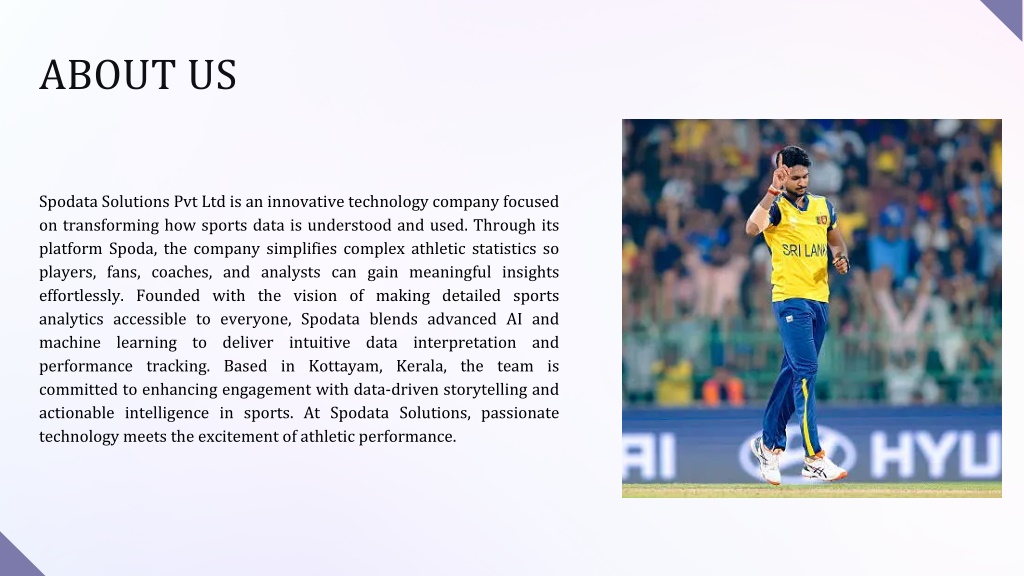 ABOUT US Spodata Solutions Pvt Ltd is an innovative technology company focused on transforming how sports data is understood and used. Through its platform Spoda, the company simplifies complex athletic statistics so players, fans, coaches, and analysts can gain meaningful insights effortlessly. Founded with the vision of making detailed sports analytics accessible to everyone, Spodata blends advanced AI and machine learning to deliver intuitive data interpretation and performance tracking. Based in Kottayam, Kerala, the team is committed to enhancing engagement with data-driven storytelling and actionable intelligence in sports. At Spodata Solutions, passionate technology meets the excitement of athletic performance.