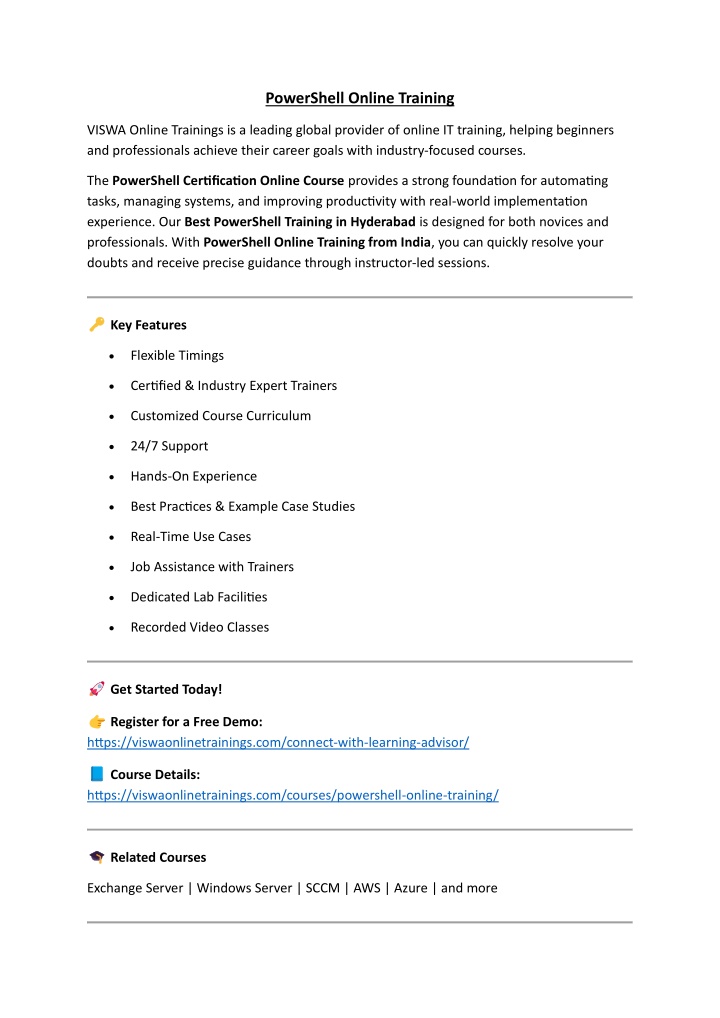 Contact Us VISWA Online Trainings India: +91 9493999586 Email: viswaonlinetrainings@gmail.com Website: https://viswaonlinetrainings.com SEO Meta Details Meta Title: PowerShell Online Training – VISWA Online Trainings Meta Description: Enroll in VISWA Online Trainings’ PowerShell Online Training. Learn automation, system management, and gain hands-on experience. Best training in Hyderabad. Keywords: PowerShell Online Training, PowerShell Certification, PowerShell Training Hyderabad, VISWA Online Trainings, System Administration Training Google Ads Description Learn PowerShell Online Training from certified experts. Best course in Hyderabad with hands-on projects & job assistance. Enroll now!