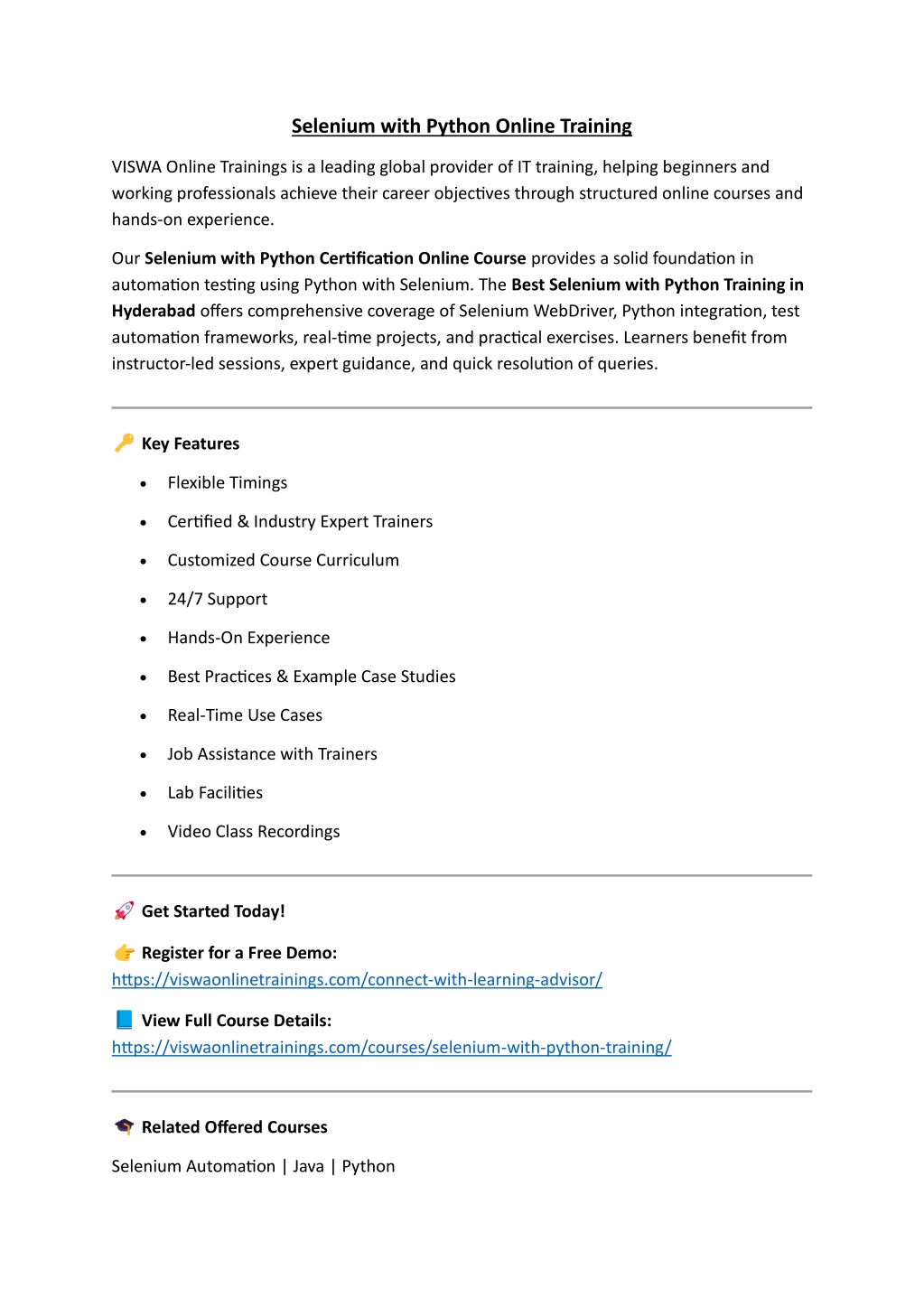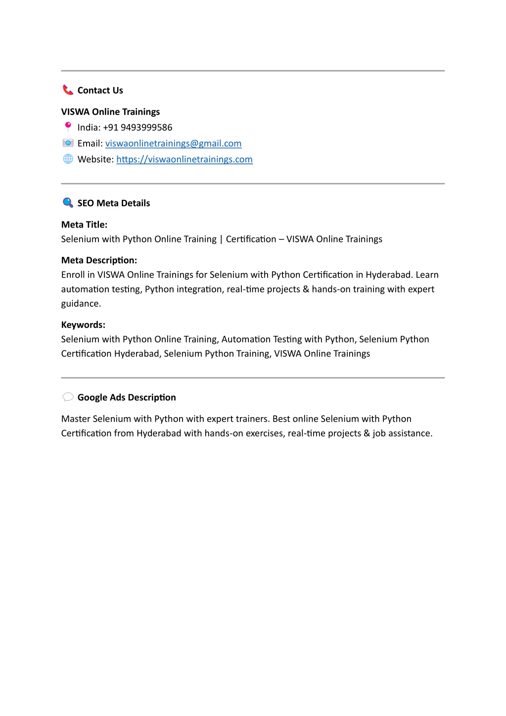 Contact Us VISWA Online Trainings India: +91 9493999586 Email: viswaonlinetrainings@gmail.com Website: https://viswaonlinetrainings.com SEO Meta Details Meta Title: Selenium with Python Online Training | Certification – VISWA Online Trainings Meta Description: Enroll in VISWA Online Trainings for Selenium with Python Certification in Hyderabad. Learn automation testing, Python integration, real-time projects & hands-on training with expert guidance. Keywords: Selenium with Python Online Training, Automation Testing with Python, Selenium Python Certification Hyderabad, Selenium Python Training, VISWA Online Trainings Google Ads Description Master Selenium with Python with expert trainers. Best online Selenium with Python Certification from Hyderabad with hands-on exercises, real-time projects & job assistance.