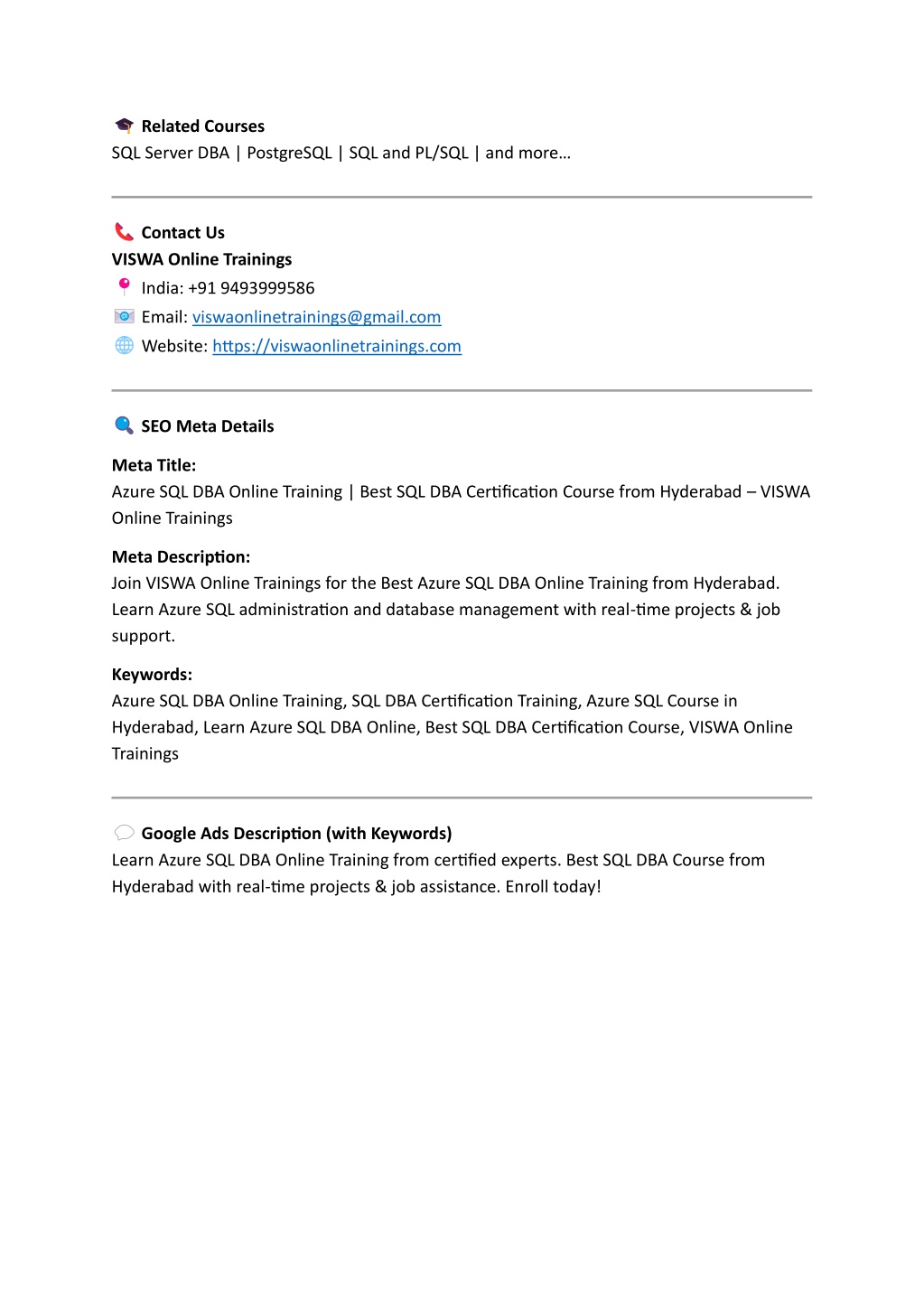 Related Courses SQL Server DBA | PostgreSQL | SQL and PL/SQL | and more… Contact Us VISWA Online Trainings India: +91 9493999586 Email: viswaonlinetrainings@gmail.com Website: https://viswaonlinetrainings.com SEO Meta Details Meta Title: Azure SQL DBA Online Training | Best SQL DBA Certification Course from Hyderabad – VISWA Online Trainings Meta Description: Join VISWA Online Trainings for the Best Azure SQL DBA Online Training from Hyderabad. Learn Azure SQL administration and database management with real-time projects & job support. Keywords: Azure SQL DBA Online Training, SQL DBA Certification Training, Azure SQL Course in Hyderabad, Learn Azure SQL DBA Online, Best SQL DBA Certification Course, VISWA Online Trainings Google Ads Description (with Keywords) Learn Azure SQL DBA Online Training from certified experts. Best SQL DBA Course from Hyderabad with real-time projects & job assistance. Enroll today!