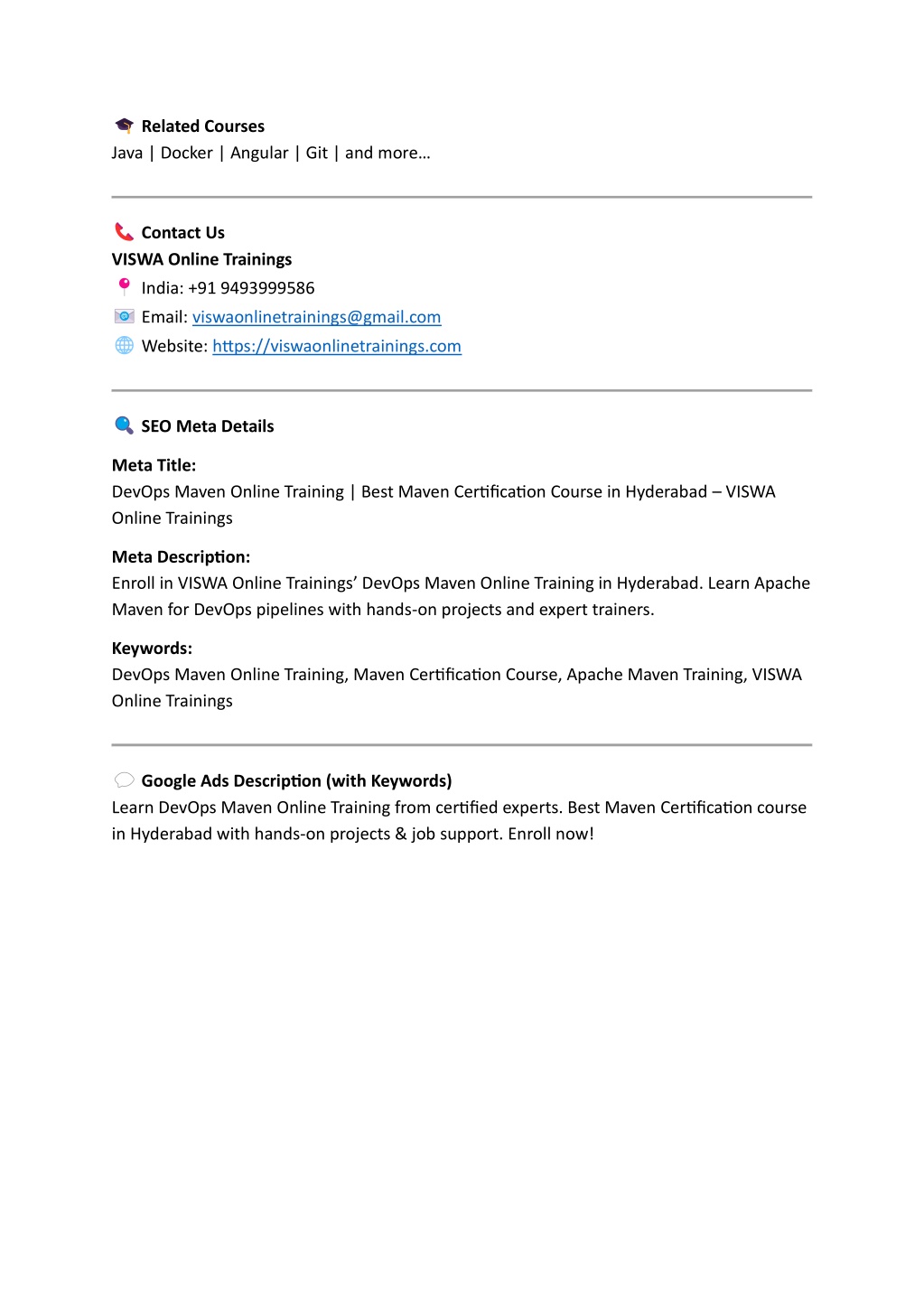 Related Courses Java | Docker | Angular | Git | and more… Contact Us VISWA Online Trainings India: +91 9493999586 Email: viswaonlinetrainings@gmail.com Website: https://viswaonlinetrainings.com SEO Meta Details Meta Title: DevOps Maven Online Training | Best Maven Certification Course in Hyderabad – VISWA Online Trainings Meta Description: Enroll in VISWA Online Trainings’ DevOps Maven Online Training in Hyderabad. Learn Apache Maven for DevOps pipelines with hands-on projects and expert trainers. Keywords: DevOps Maven Online Training, Maven Certification Course, Apache Maven Training, VISWA Online Trainings Google Ads Description (with Keywords) Learn DevOps Maven Online Training from certified experts. Best Maven Certification course in Hyderabad with hands-on projects & job support. Enroll now!