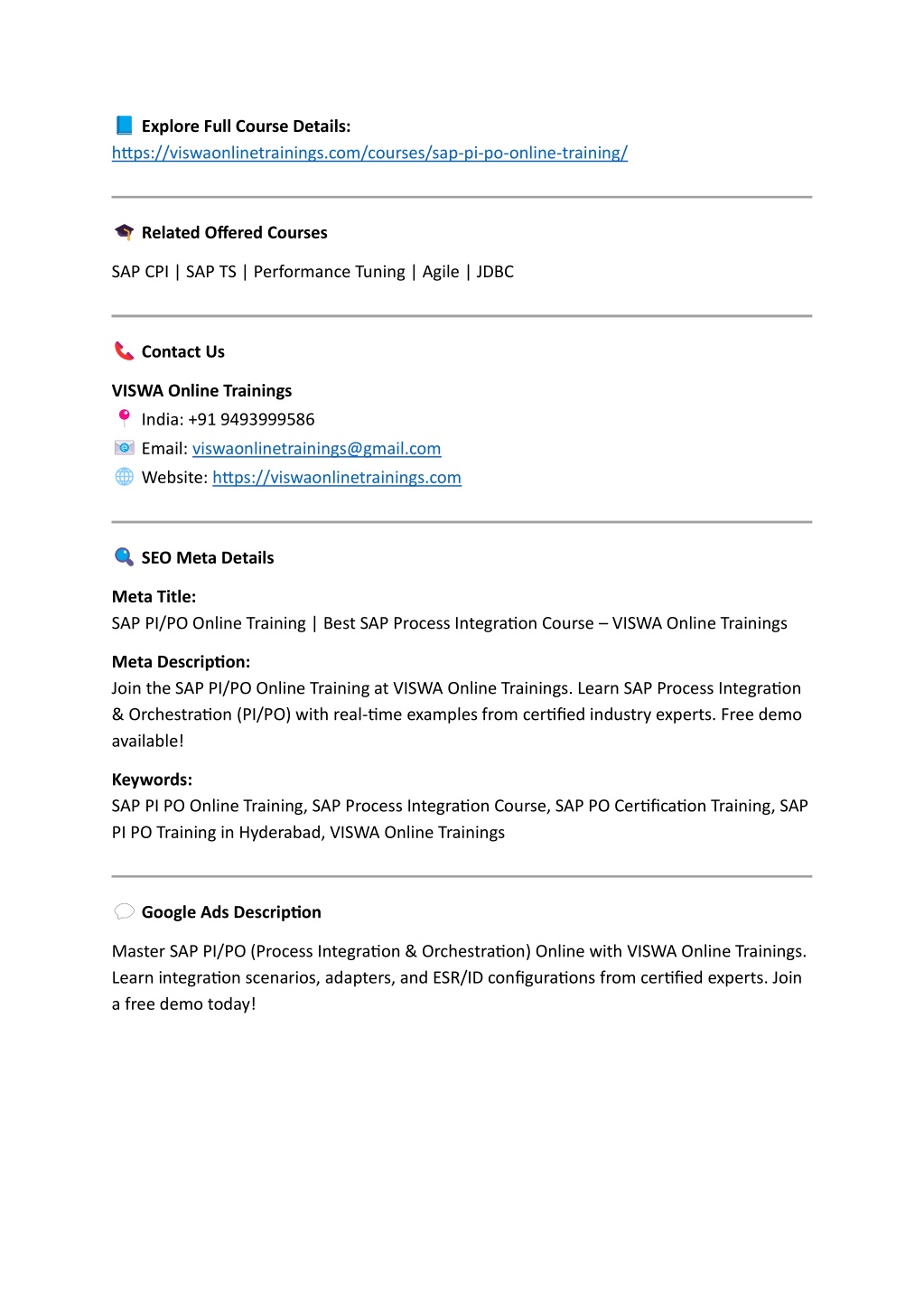 Explore Full Course Details: https://viswaonlinetrainings.com/courses/sap-pi-po-online-training/ Related Offered Courses SAP CPI | SAP TS | Performance Tuning | Agile | JDBC Contact Us VISWA Online Trainings India: +91 9493999586 Email: viswaonlinetrainings@gmail.com Website: https://viswaonlinetrainings.com SEO Meta Details Meta Title: SAP PI/PO Online Training | Best SAP Process Integration Course – VISWA Online Trainings Meta Description: Join the SAP PI/PO Online Training at VISWA Online Trainings. Learn SAP Process Integration & Orchestration (PI/PO) with real-time examples from certified industry experts. Free demo available! Keywords: SAP PI PO Online Training, SAP Process Integration Course, SAP PO Certification Training, SAP PI PO Training in Hyderabad, VISWA Online Trainings Google Ads Description Master SAP PI/PO (Process Integration & Orchestration) Online with VISWA Online Trainings. Learn integration scenarios, adapters, and ESR/ID configurations from certified experts. Join a free demo today!