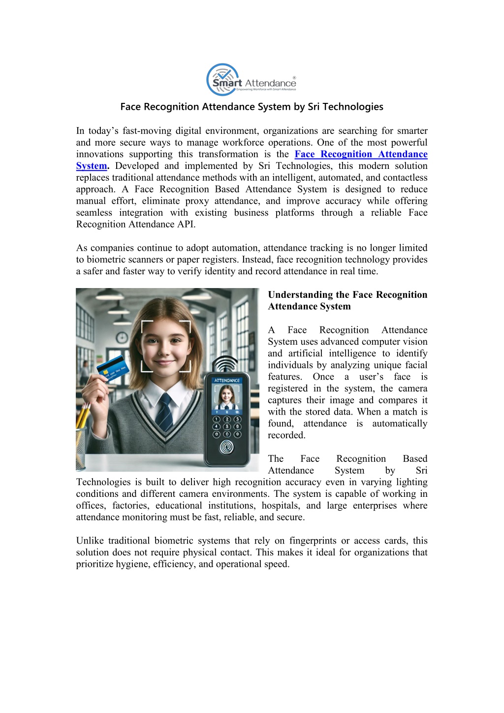 Security and Data Protection Security is a critical concern when implementing any biometric technology. The Face Recognition Attendance System by Sri Technologies uses encrypted data storage and secure communication protocols to protect facial templates and attendance records. Access control mechanisms ensure that only authorized users can view or modify sensitive information. The Face Recognition Attendance API also follows strict authentication and authorization procedures, making it safe for enterprise-level integrations. By combining secure infrastructure with responsible data management practices, Sri Technologies helps organizations maintain compliance with internal security policies and data protection standards. Industry Applications The Face Recognition Based Attendance System is widely applicable across various industries. In corporate offices, it supports flexible work schedules and hybrid work environments. In educational institutions, it automates classroom attendance and improves administrative efficiency. In manufacturing and industrial facilities, it ensures accurate shift tracking and workforce accountability. Healthcare organizations can also benefit from fast and touch-free staff verification, especially in high-traffic areas. The versatility of the Face Recognition Attendance API further enables customized implementations for different operational requirements. Conclusion The Face Recognition Attendance System offered by Sri Technologies represents a significant step forward in workforce automation and identity verification. By combining artificial intelligence, real-time recognition, and secure system architecture, this Face Recognition Based Attendance System delivers unmatched accuracy, speed, and reliability. The availability of a robust Face Recognition Attendance API allows organizations to integrate attendance data seamlessly into their existing digital ecosystems. As businesses continue to adopt smart technologies to improve productivity and transparency, implementing a modern face recognition attendance solution is no longer a luxury but a strategic necessity. With its advanced features, strong security framework, and scalable design, Sri Technologies provides organizations with a future-ready attendance management solution that supports efficiency, compliance, and long-term digital growth.