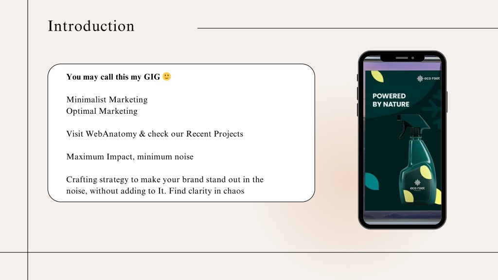 Introduction You may call this my GIG ? Minimalist Marketing Optimal Marketing Visit WebAnatomy & check our Recent Projects Maximum Impact, minimum noise Crafting strategy to make your brand stand out in the noise, without adding to It. Find clarity in chaos