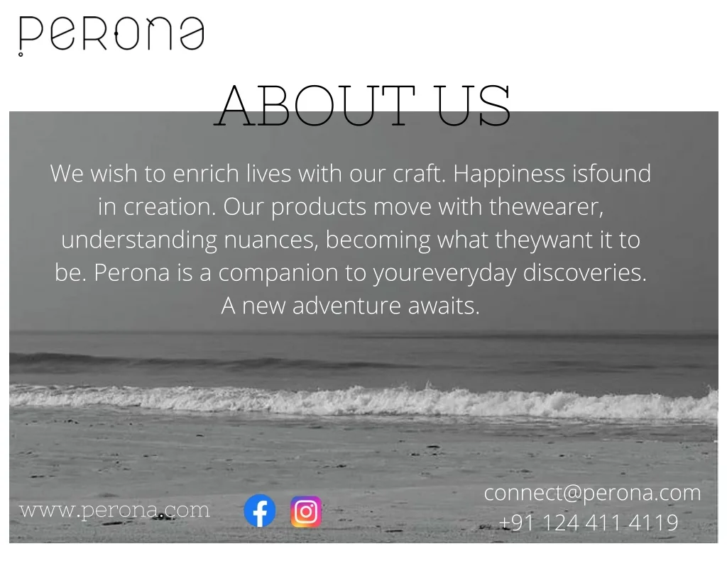 ABOUT US We wish to enrich lives with our craft. Happiness isfound in creation. Our products move with thewearer, understanding nuances, becoming what theywant it to be. Perona is a companion to youreveryday discoveries. A new adventure awaits. connect@perona.com www.perona.com +91 124 411 4119