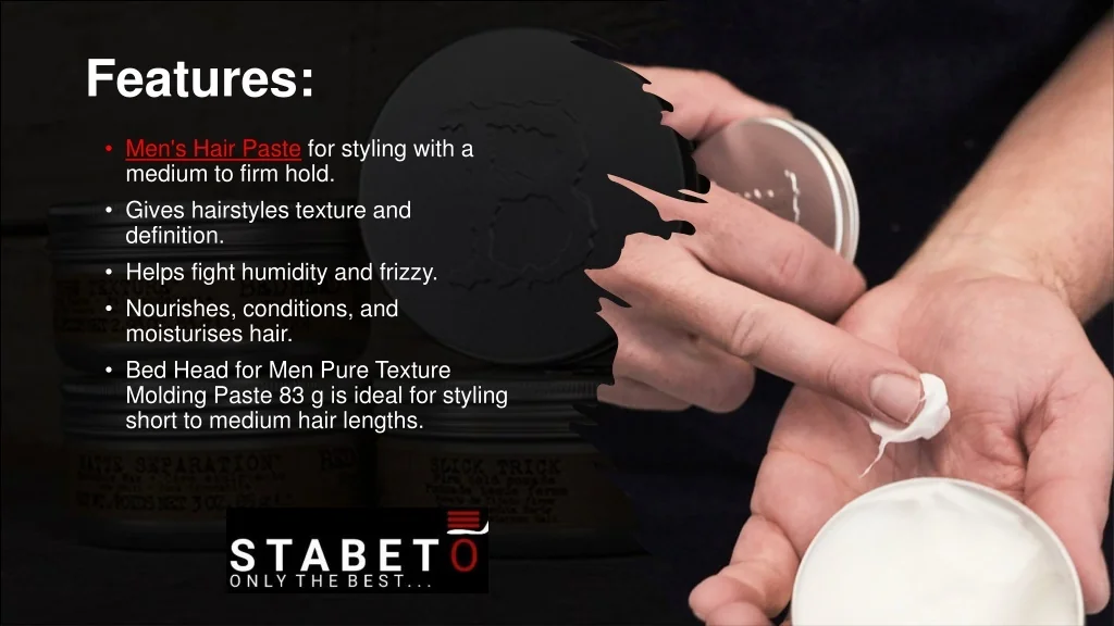 Buy Tigi Bed Head Hair Paste for Firm Hold for Men this is ideal for guys who want texture and definition. The hair styling paste has a medium to firm hold. The TIGI Bedhead for Men Pure Texture Molding Paste gives you perfect styling flexibility. Tigi Bed Head Hair Paste Helps to fight humidity, frizzy and Nourishes, conditions, and moisturises hair. Grab it now from STABETO