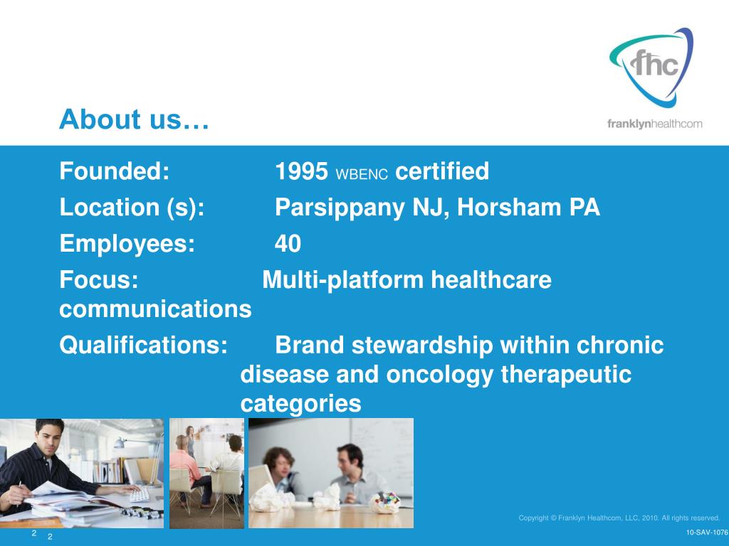 Founded: 1995 WBENC certified Location (s): Parsippany NJ, Horsham PA Employees: 40 Focus: Multi-platform healthcare communications Qualifications:Brand stewardship within chronic disease and oncology therapeutic categories About us… Copyright © Franklyn Healthcom, LLC, 2010. All rights reserved. 2 2 10-SAV-1076