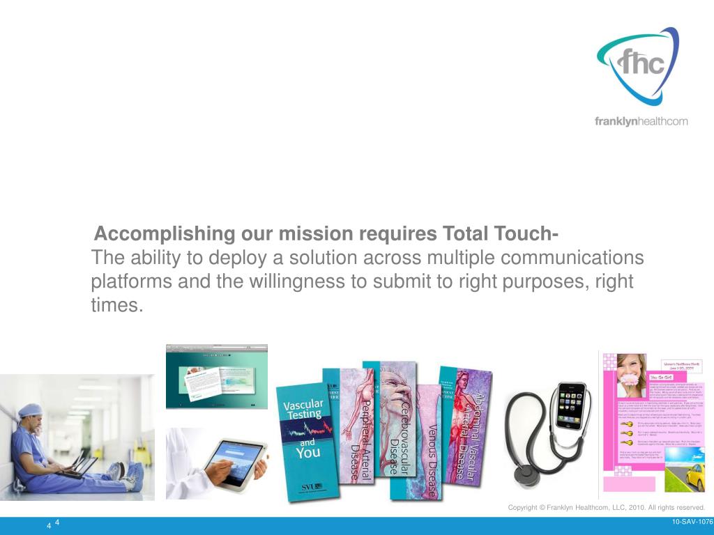 Accomplishing our mission requires Total Touch- The ability to deploy a solution across multiple communications platforms and the willingness to submit to right purposes, right times. Copyright © Franklyn Healthcom, LLC, 2010. All rights reserved. 4 4 10-SAV-1076