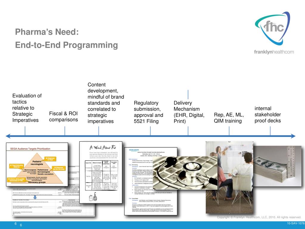 Pharma’s Need: End-to-End Programming Content development, mindful of brand standards and correlated to strategic imperatives Evaluation of tactics relative to Strategic Imperatives Regulatory submission, approval and 5521 Filing Delivery Mechanism (EHR, Digital, Print) internal stakeholder proof decks Fiscal & ROI comparisons Rep, AE, ML, QIM training Copyright © Franklyn Healthcom, LLC, 2010. All rights reserved. 6 6 10-SAV-1076