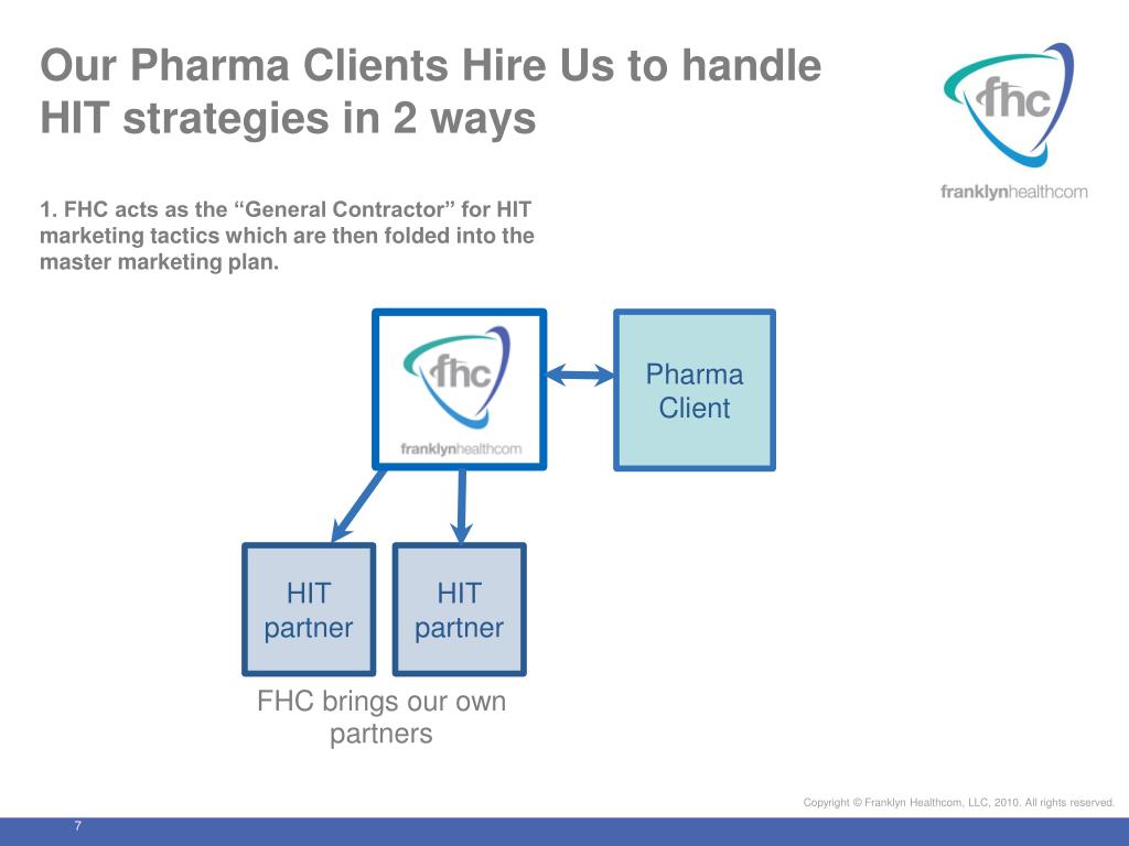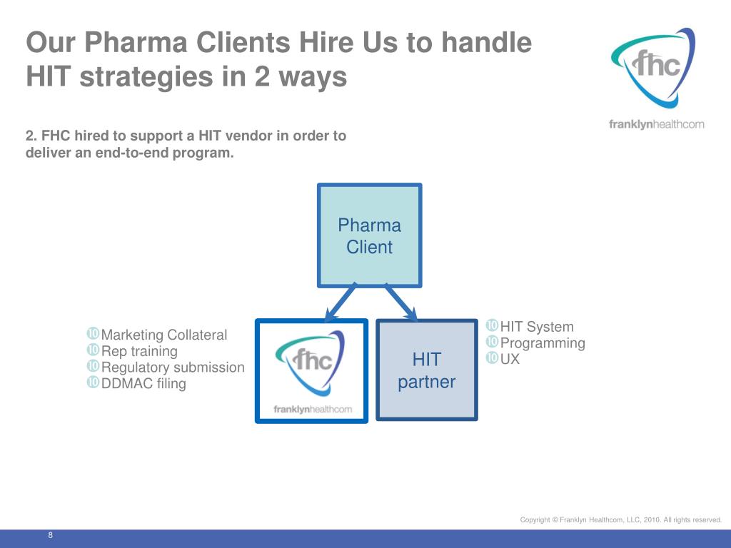 Our Pharma Clients Hire Us to handle HIT strategies in 2 ways 1. FHC acts as the “General Contractor” for HIT marketing tactics which are then folded into themaster marketing plan. Pharma Client HIT partner HIT partner FHC brings our own partners Copyright © Franklyn Healthcom, LLC, 2010. All rights reserved. 7
