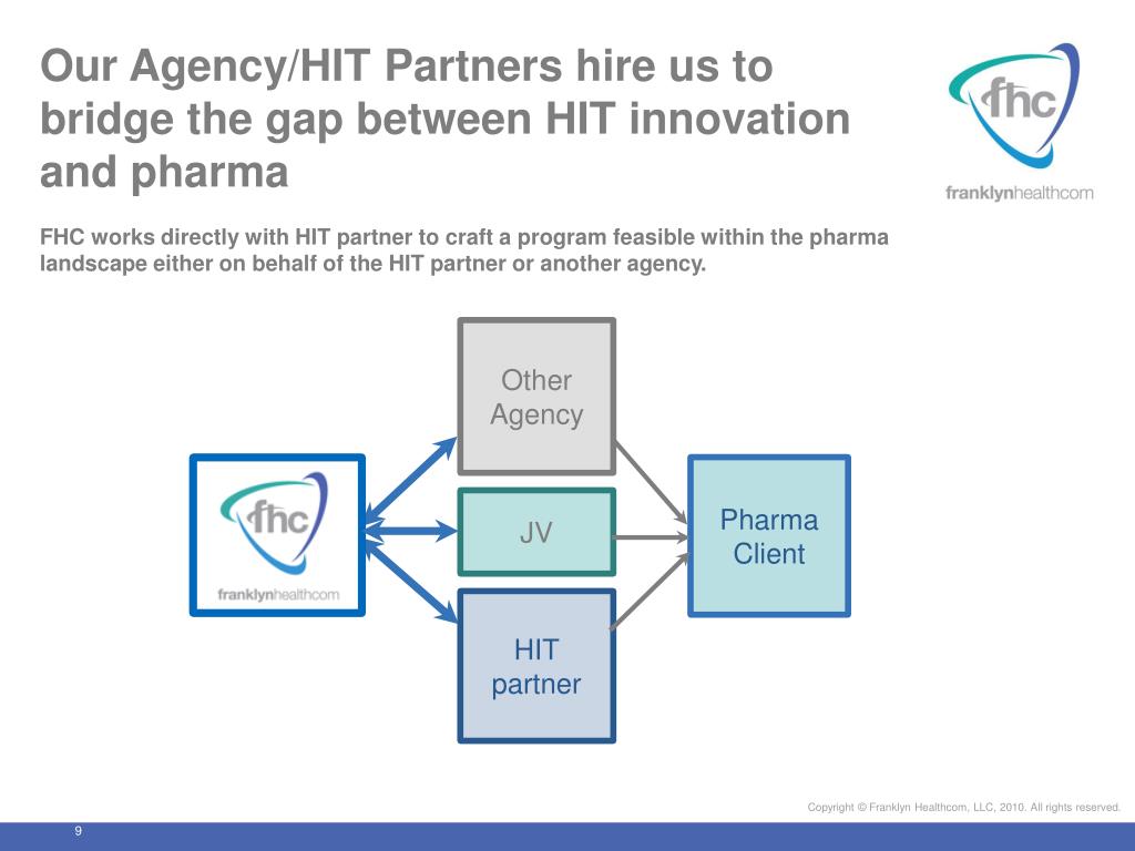Our Pharma Clients Hire Us to handle HIT strategies in 2 ways 2. FHC hired to support a HIT vendor in order todeliver an end-to-end program. Pharma Client Other Agency Other Agency • HIT System • Programming • UX HIT partner • Marketing Collateral • Rep training • Regulatory submission • DDMAC filing Other Agency Copyright © Franklyn Healthcom, LLC, 2010. All rights reserved. 8