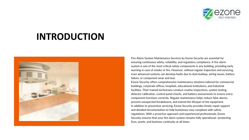 INTRODUCTION Fire Alarm System Maintenance Services by Ezone Security are essential for ensuring continuous safety, reliability, and regulatory compliance. A fire alarm system is one of the most critical safety components in any building, providing early warning in case of smoke or fire. However, without regular inspection and servicing, even advanced systems can develop faults due to dust buildup, wiring issues, battery failure, or component wear and tear. Ezone Security offers comprehensive maintenance solutions tailored for commercial buildings, corporate offices, hospitals, educational institutions, and industrial facilities. Their trained technicians conduct routine inspections, system testing, detector calibration, control panel checks, and battery assessments to ensure every component functions correctly. Regular maintenance helps reduce false alarms, prevent unexpected breakdowns, and extend the lifespan of the equipment. In addition to preventive servicing, Ezone Security provides timely repair support and detailed documentation to help businesses stay compliant with safety regulations. With a proactive approach and experienced professionals, Ezone Security ensures that your fire alarm system remains fully operational—protecting lives, assets, and business continuity at all times.