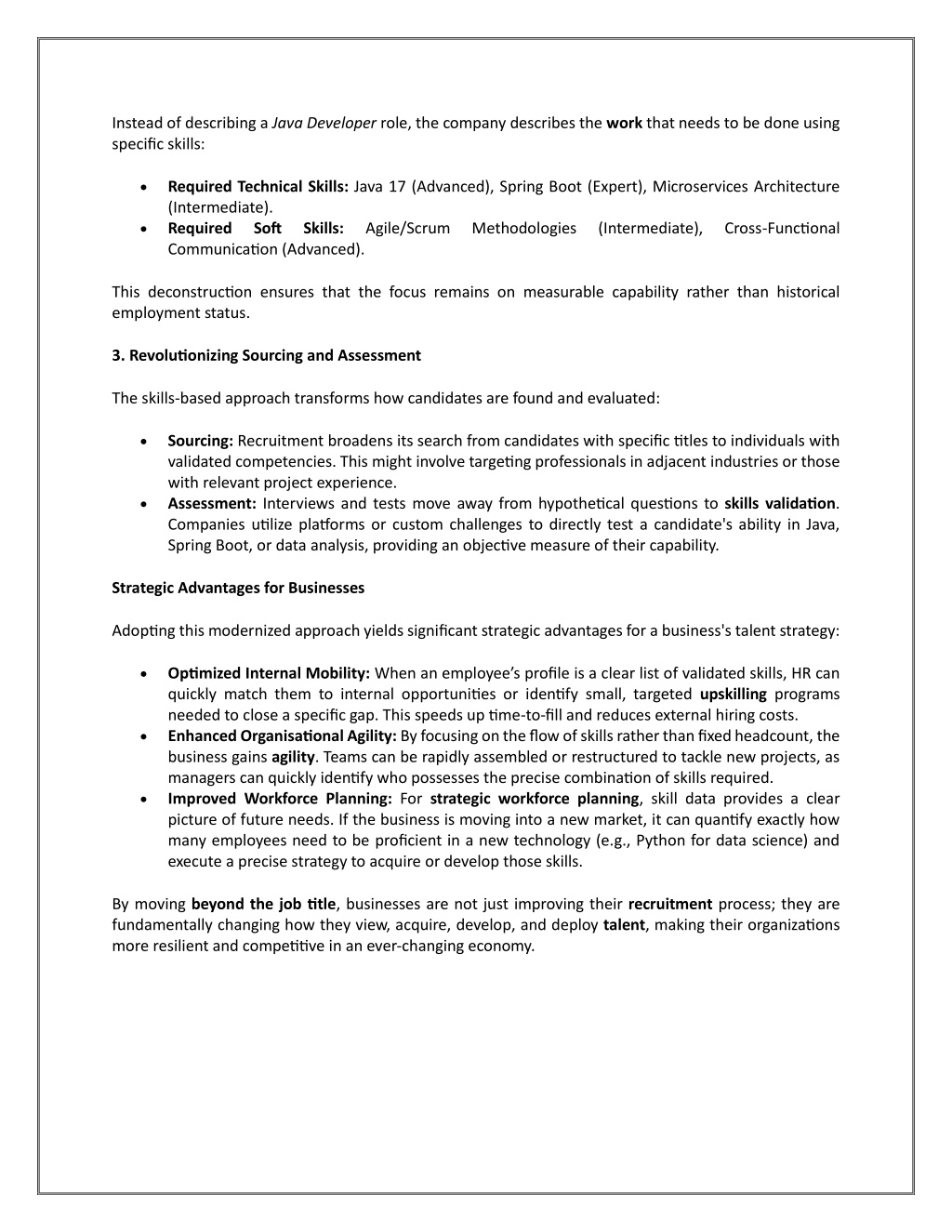 Instead of describing a Java Developer role, the company describes the work that needs to be done using specific skills: • Required Technical Skills: Java 17 (Advanced), Spring Boot (Expert), Microservices Architecture (Intermediate). Required Soft Skills: Agile/Scrum Methodologies Communication (Advanced). • (Intermediate), Cross-Functional This deconstruction ensures that the focus remains on measurable capability rather than historical employment status. 3. Revolutionizing Sourcing and Assessment The skills-based approach transforms how candidates are found and evaluated: • Sourcing: Recruitment broadens its search from candidates with specific titles to individuals with validated competencies. This might involve targeting professionals in adjacent industries or those with relevant project experience. Assessment: Interviews and tests move away from hypothetical questions to skills validation. Companies utilize platforms or custom challenges to directly test a candidate's ability in Java, Spring Boot, or data analysis, providing an objective measure of their capability. • Strategic Advantages for Businesses Adopting this modernized approach yields significant strategic advantages for a business's talent strategy: • Optimized Internal Mobility: When an employee’s profile is a clear list of validated skills, HR can quickly match them to internal opportunities or identify small, targeted upskilling programs needed to close a specific gap. This speeds up time-to-fill and reduces external hiring costs. Enhanced Organisational Agility: By focusing on the flow of skills rather than fixed headcount, the business gains agility. Teams can be rapidly assembled or restructured to tackle new projects, as managers can quickly identify who possesses the precise combination of skills required. Improved Workforce Planning: For strategic workforce planning, skill data provides a clear picture of future needs. If the business is moving into a new market, it can quantify exactly how many employees need to be proficient in a new technology (e.g., Python for data science) and execute a precise strategy to acquire or develop those skills. • • By moving beyond the job title, businesses are not just improving their recruitment process; they are fundamentally changing how they view, acquire, develop, and deploy talent, making their organizations more resilient and competitive in an ever-changing economy.